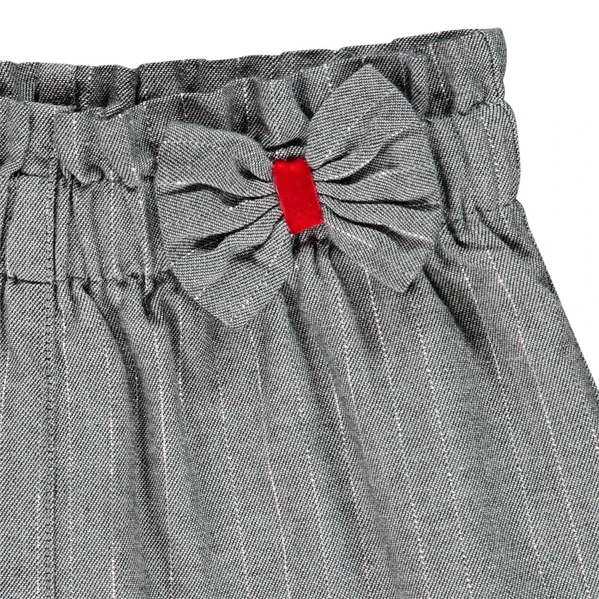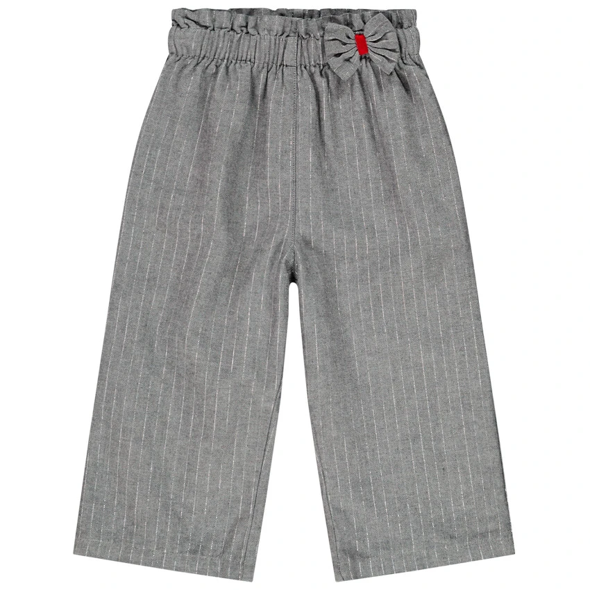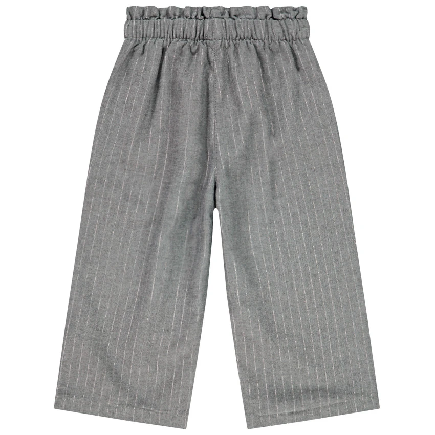 Pantalon large gris en maille. Fines rayures argentées. Taille élastiquée avec noeud cousu à la taille.