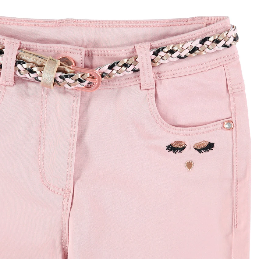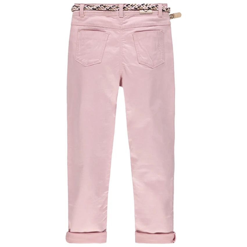 Pantalon slim rose pâle. Taille ajustable de l’intérieur par élastique et boutons. Ceinture à passants avec bouton et braguette zippée. 2 poches cavalières et 1 poche ticket. Ceinture tressée ajustable amovible. Broderies sous la poche de gauche. 2 poches plaquées au dos.
