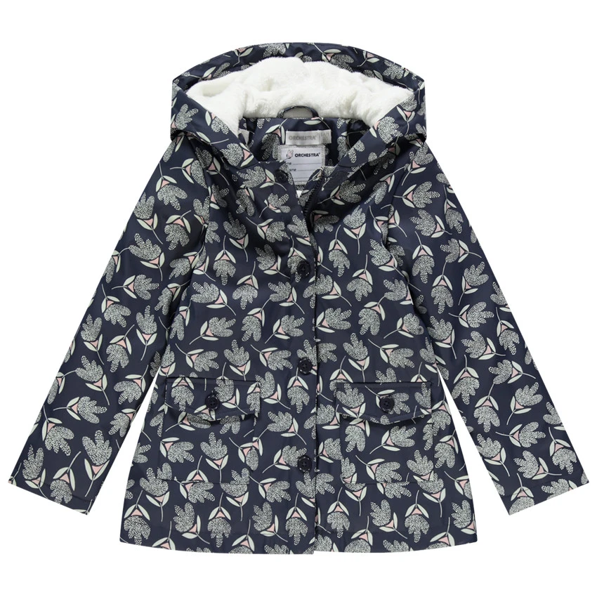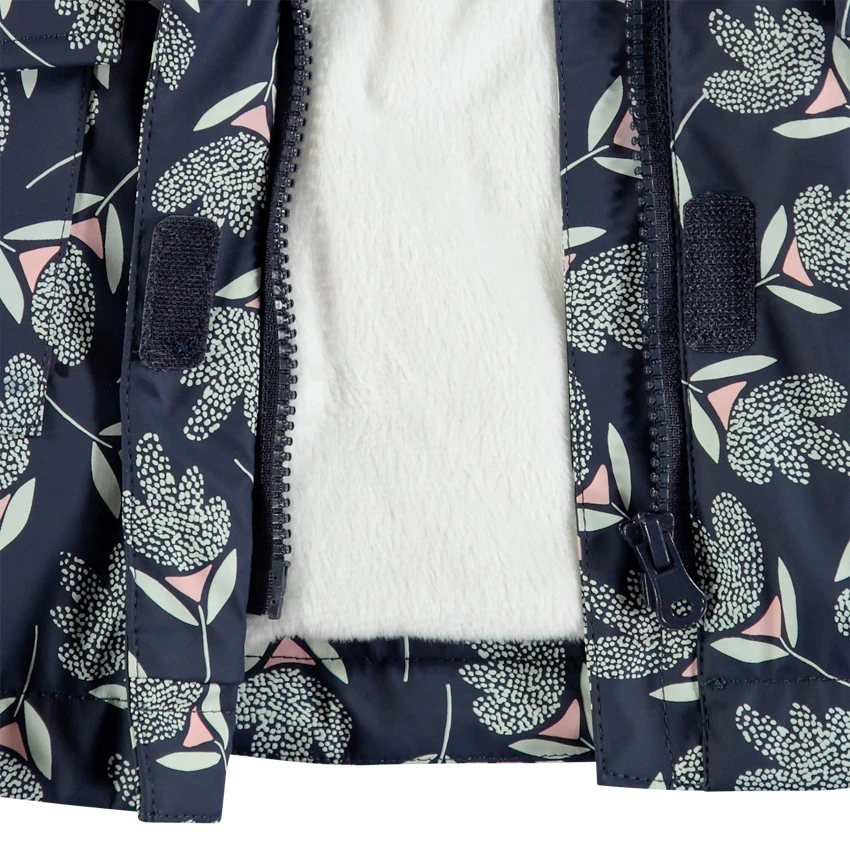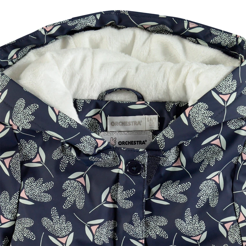 Parka à capuche en gomme. Doublure en sherpa. Ouverture zippée sous patte à scratch. 2 poches à rabat devant.
