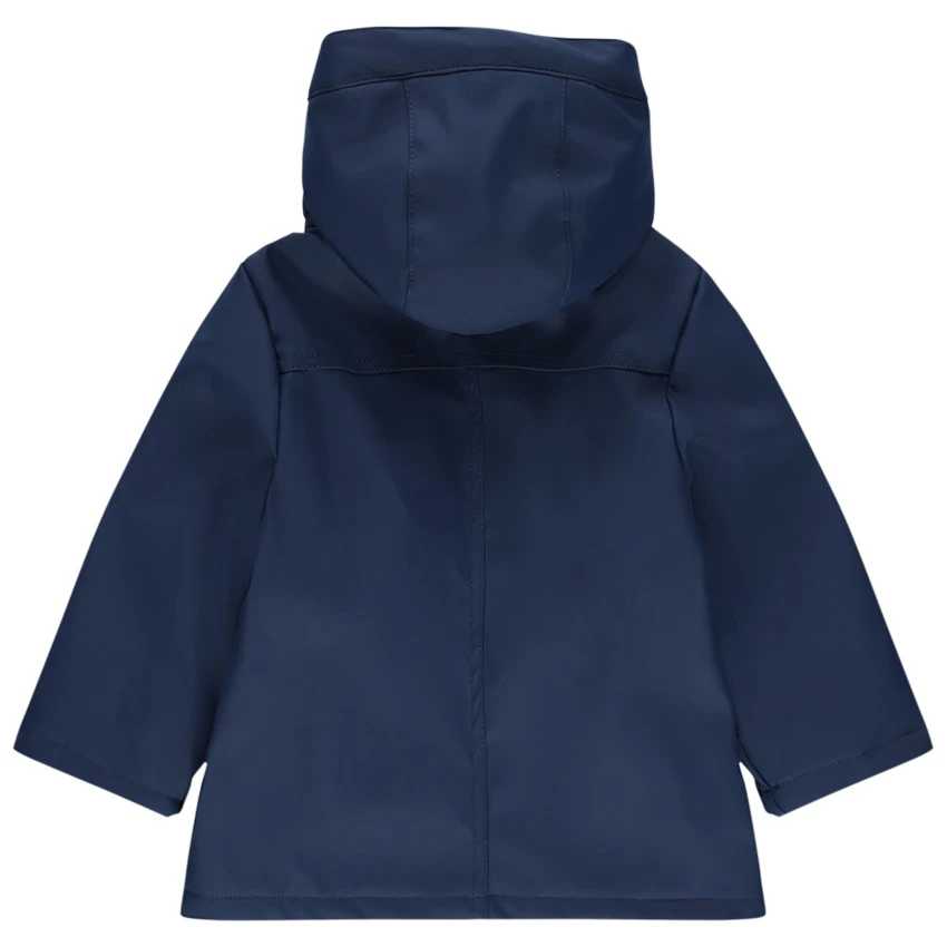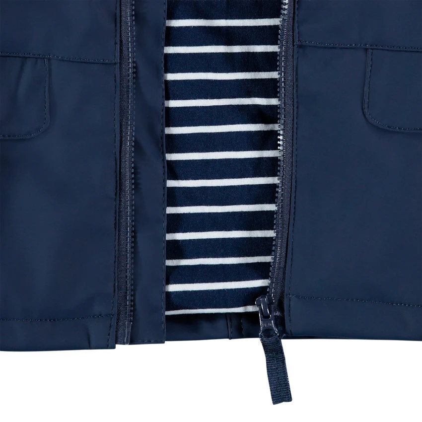 Parka en gomme. Doublure en jersey à rayures. Capuche amovible par zip. Ouverture zippée devant. 2 poches à rabat devant.
