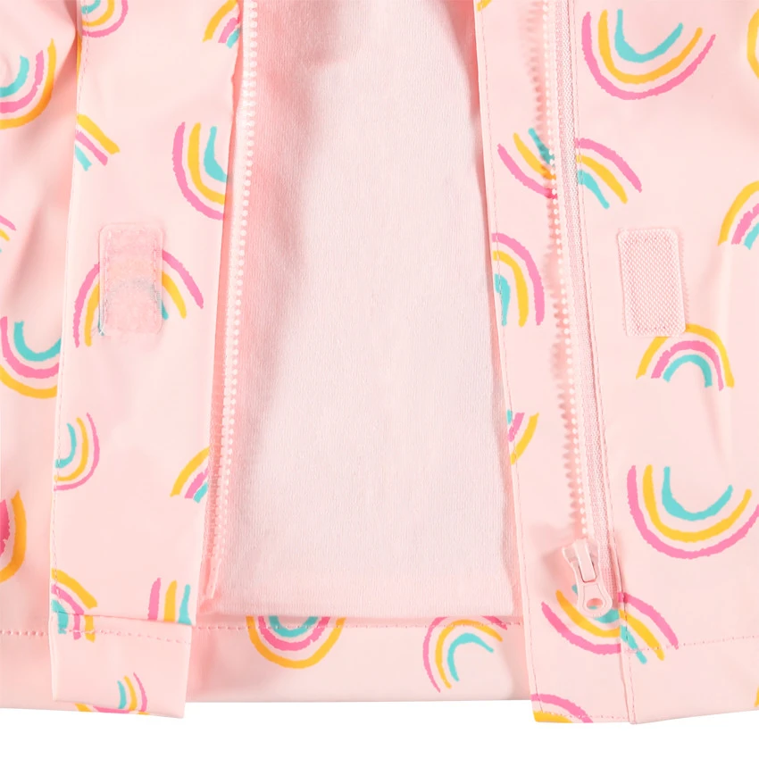 Parka en gomme imprimée arc-en-ciel all-over. Doublure en jersey. Capuche amovible par zip. Passepoil contrasté sur le devant. Ouverture zippée sous patte à scratch.