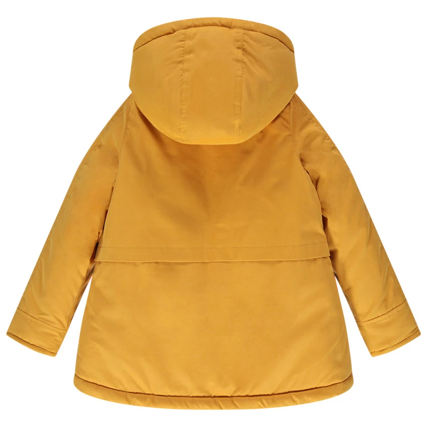 Parka à capuche unie doublée sherpa. Ouverture zippée sous patte pressionnée. 2 poches zippées devant.