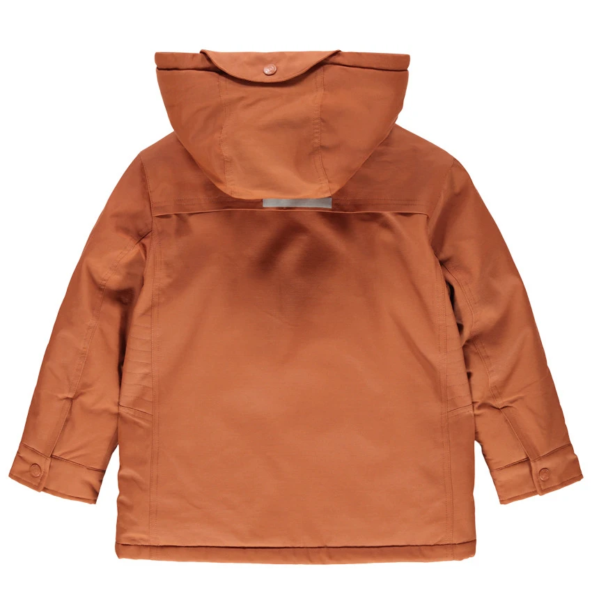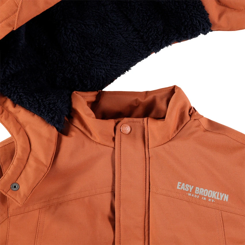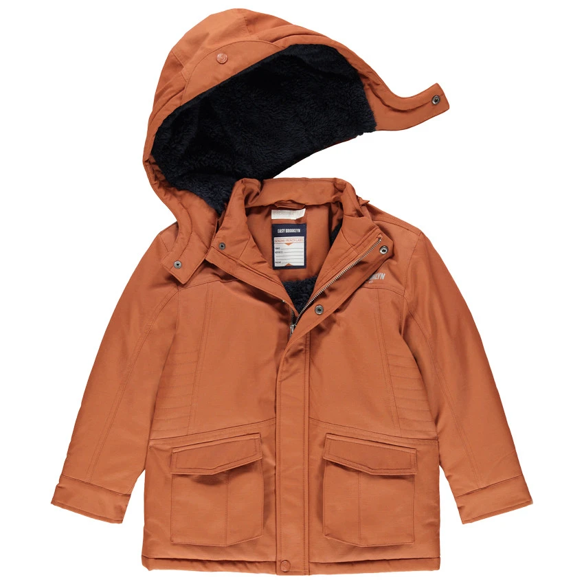 Parka en twill. Doublure sherpa. Capuche amovible par zip. Ouverture zippée sous patte pressionnée. 2 poches à rabat devant. Jeux de surpiqûres. Poignets pressionnés.