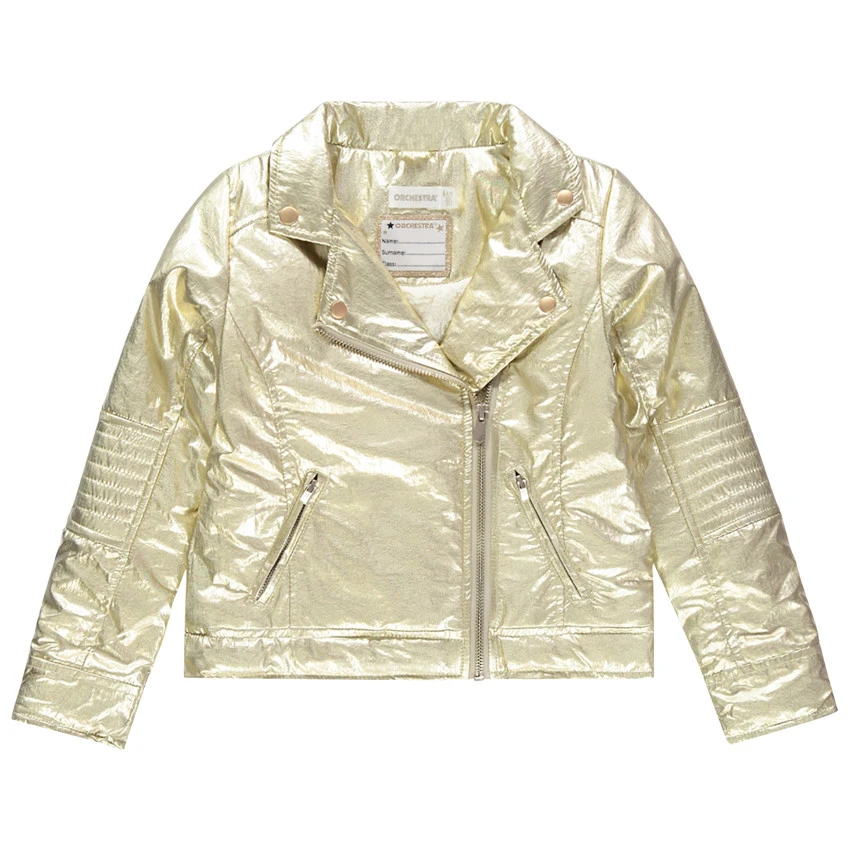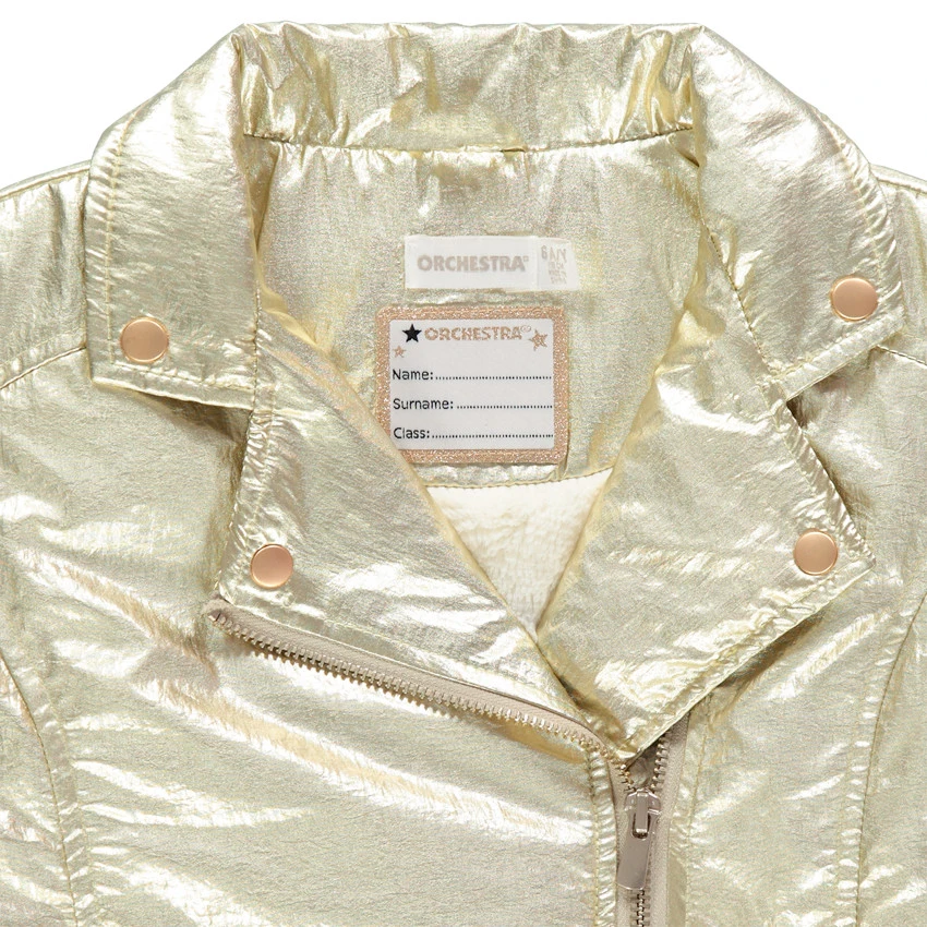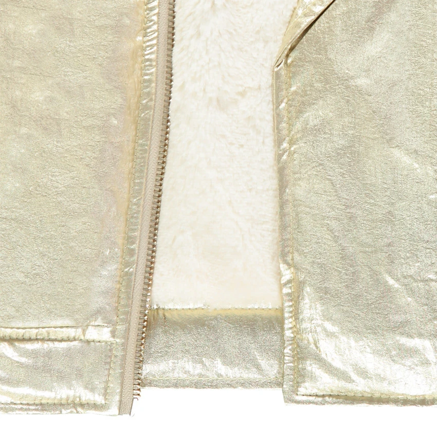 Perfecto doré effet métallisé. Col cranté avec rivets métalliques. Ouverture zippée devant. Jeux de surpiqûres sur les manches. 2 poches zippées devant. Doublure en sherpa.