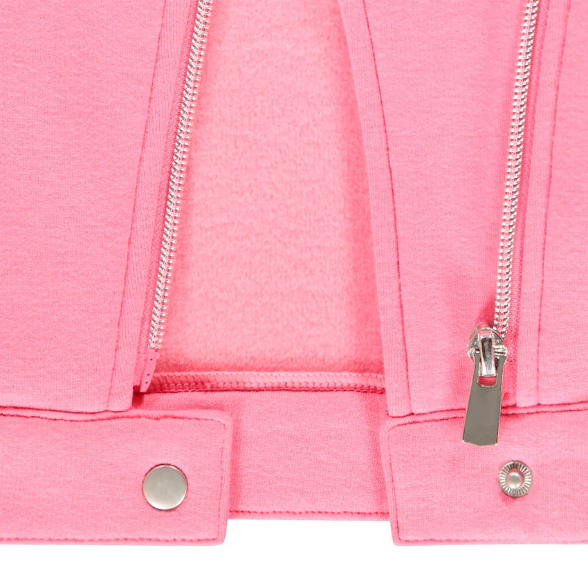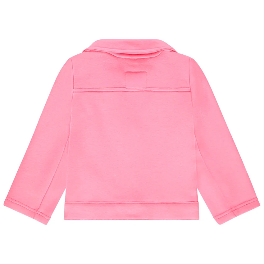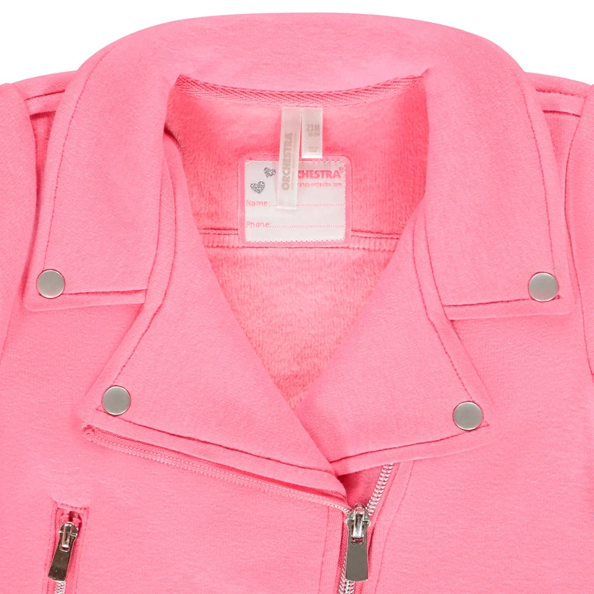 Perfecto en molleton rose pour enfant fille. Col cranté avec rivets fantaisie. Doublure brossée. Ouverture zippée en biais. 1 poche zippée sur le devant. Coeurs argentés brodés. patte pressionnée sur la base du perfecto.