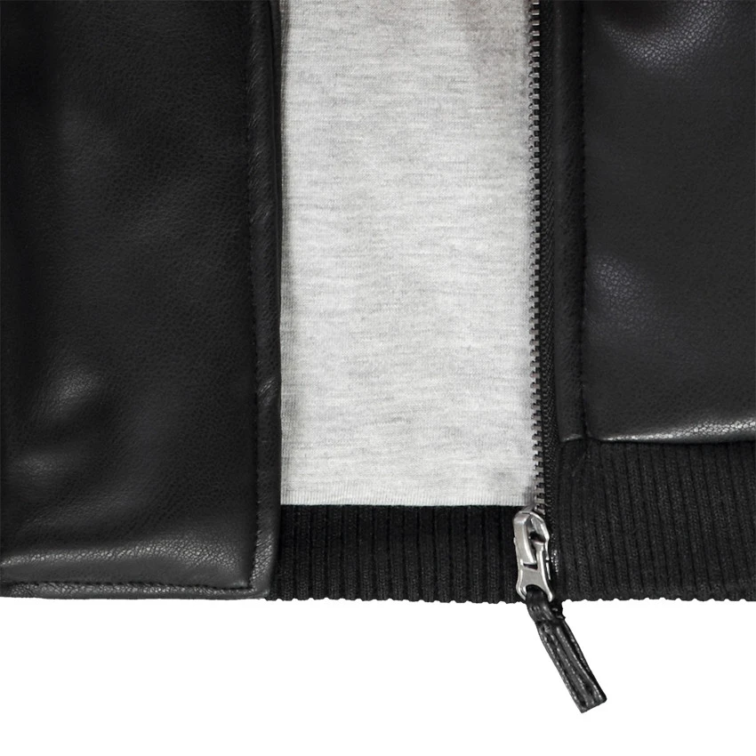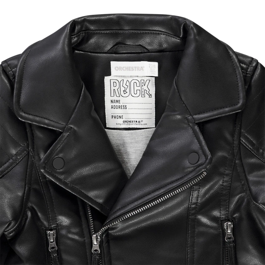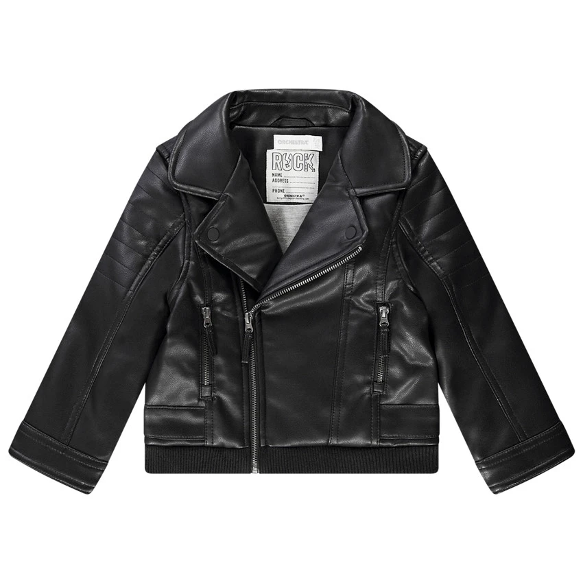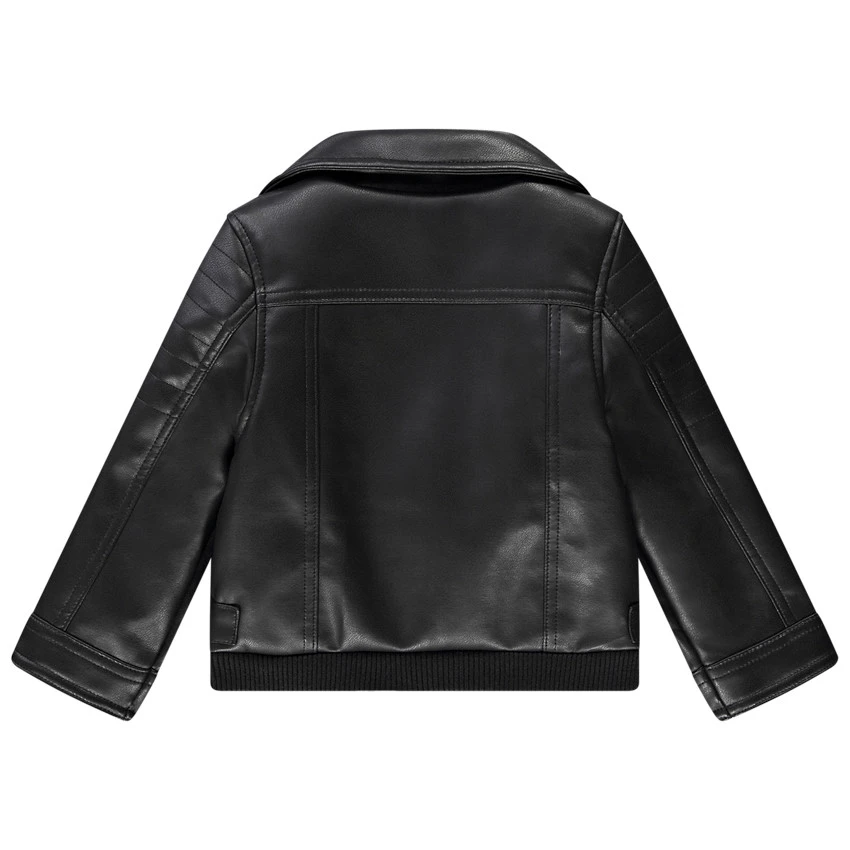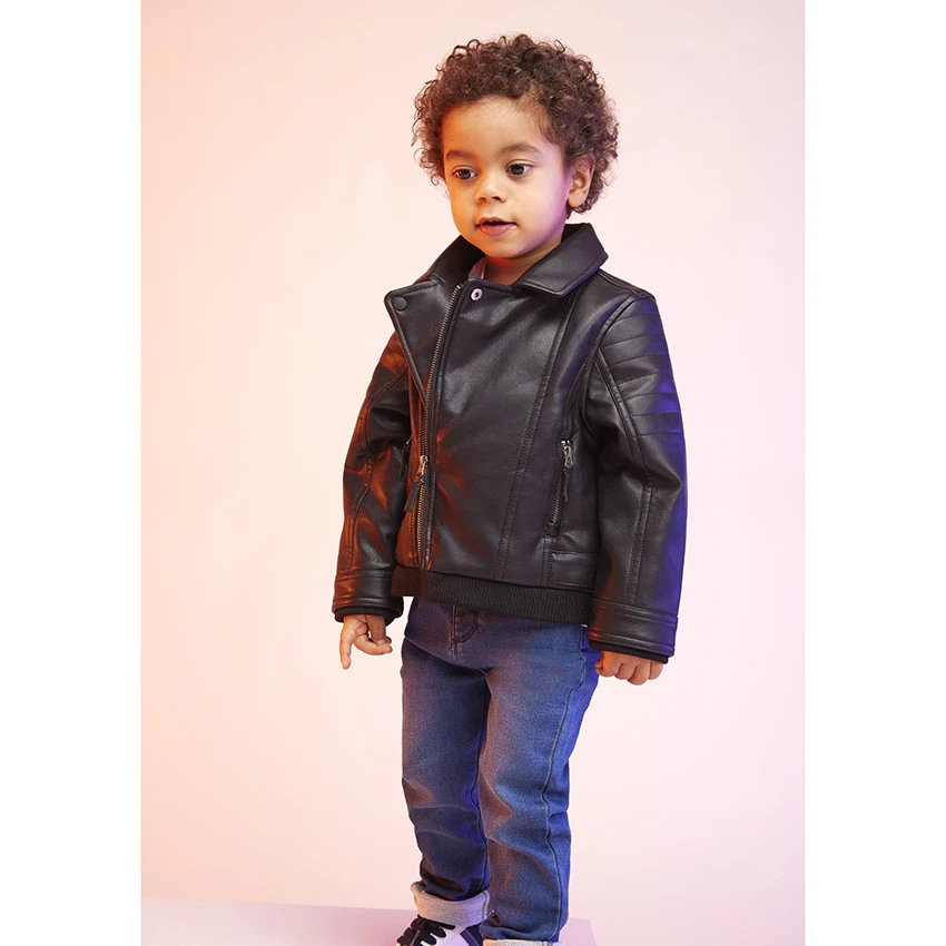 Perfecto en simili cuir pour bébé garçon. Doublure en jersey. Col cranté. Ouverture zippée sur le devant. 2 poches zippées devant. Intérieur des poignets et base en bord-côte. Surpiqûres sur les manches.