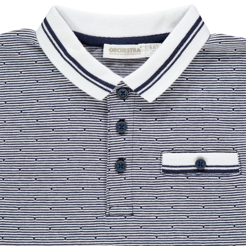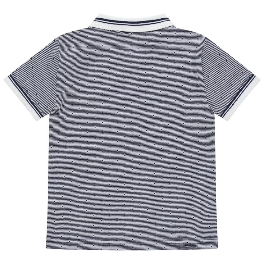 Polo manches courtes à rayures et points en jacquard all-over. Col polo à ouverture boutonnée sur le devant. 1 poche passepoilée sur la poitrine avec bouton. Finition en bord-côte rayé au bout des manches .