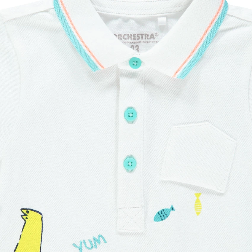 Polo manches courtes en coton piqué. Col chemise boutonné devant. Crocodile reliéfé. Poche plaquée à l’envers avec petits poissons printés Dos uni.