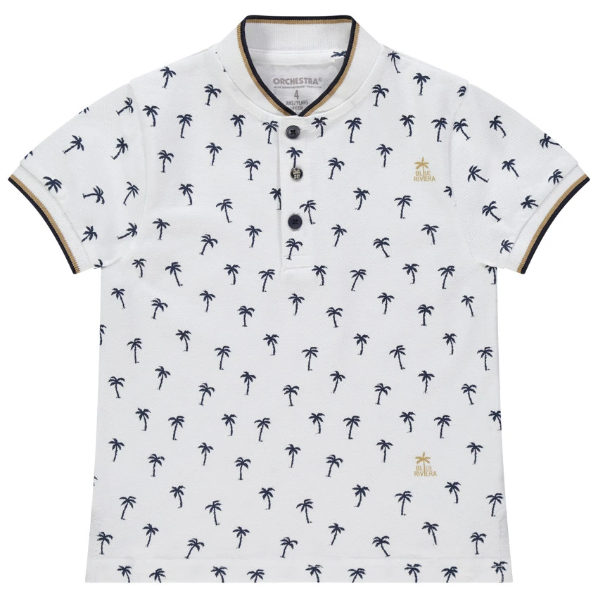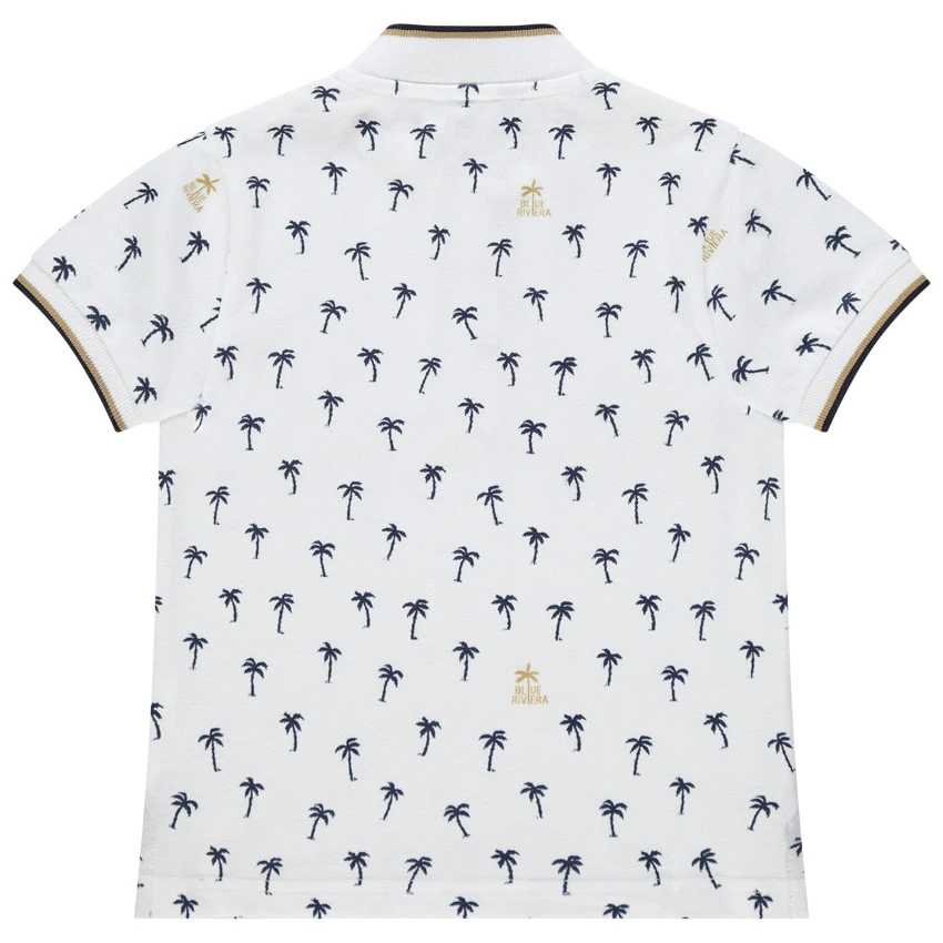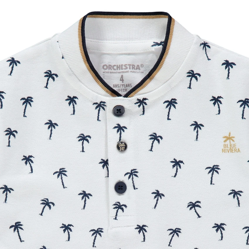 Polo manches courtes en coton piqué. Col esprit teddy rayé boutonné sur le devant avec pression fantaisie. Logos dorés pintés placés devant et au dos. Palmiers imprimés all-over. Bout des manches en bord-côte rayé.