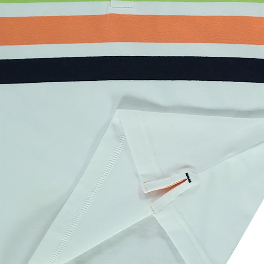 Polo manches courtes. Rayures au niveau de la poitrine. Col chemise. Col et emmanchures en bord côte contrasté. Manches avec liserés contrastés Ouverture boutonnée sur le devant. Dos uni.
