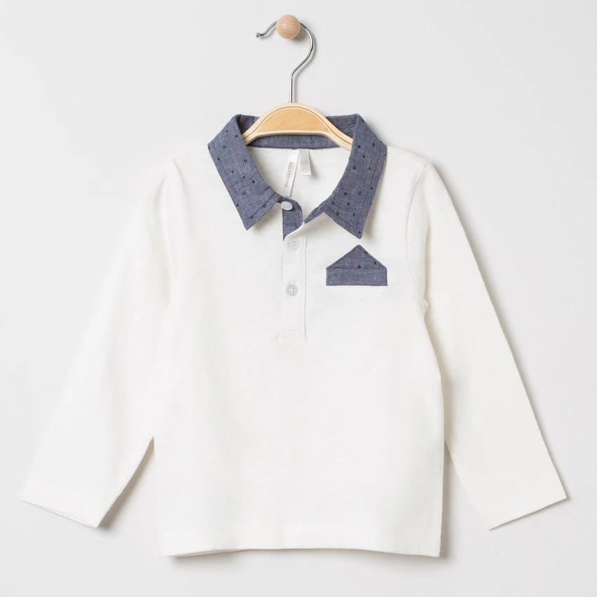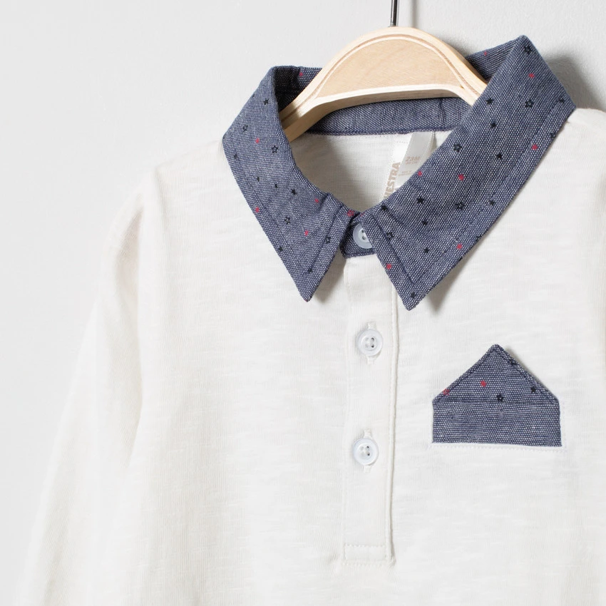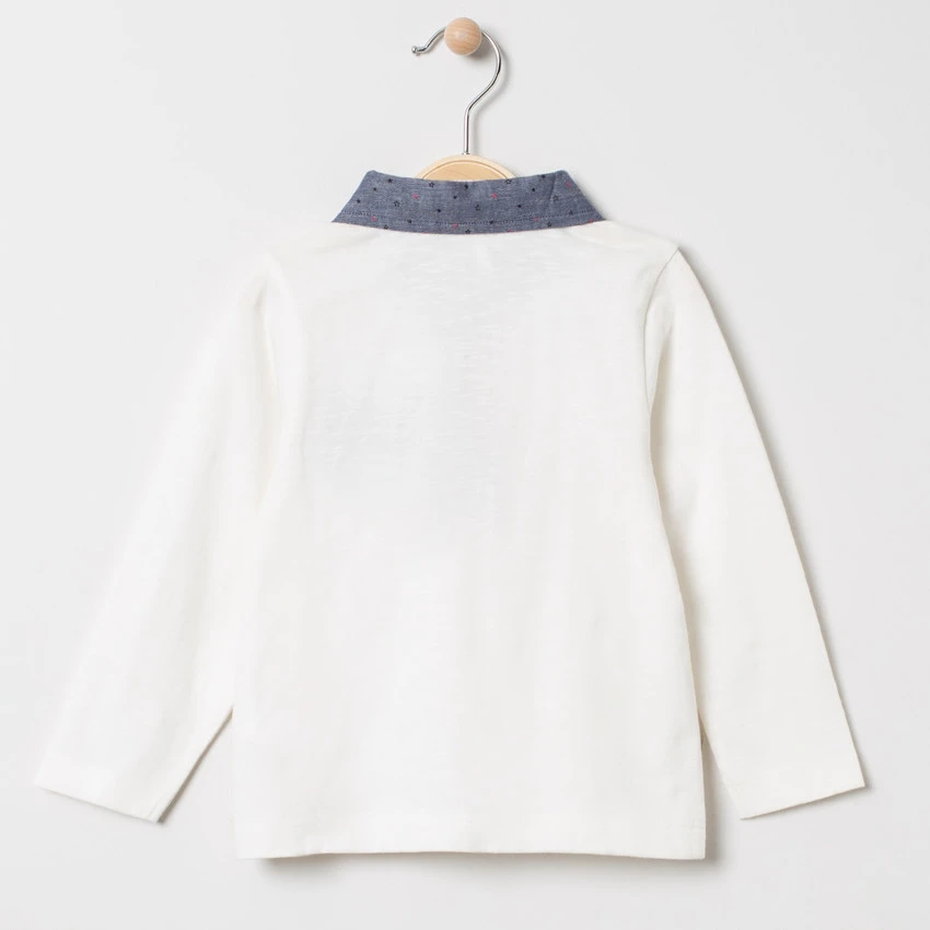 Polo manches longues en coton. Col en chambray imprimé boutonné devant. 1 poche sur la poitrine avec détail imprimé. Dos uni.
