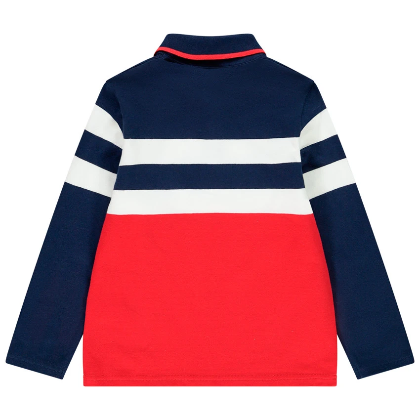 Polo manches longues. Col de polo contrasté. Rayures larges sur la poitrine. Ouverture boutonnée.