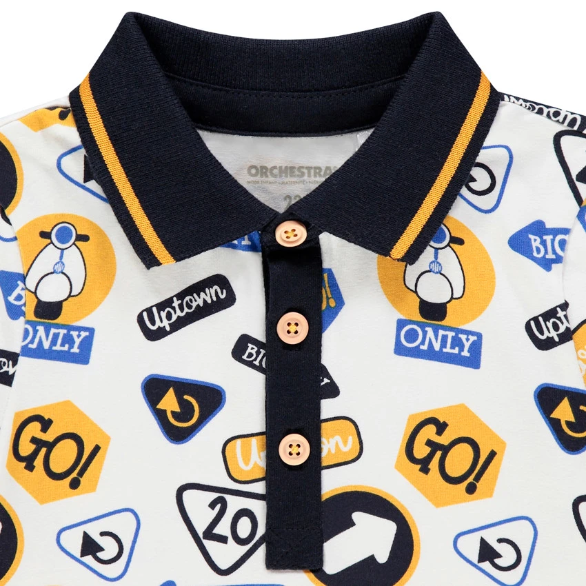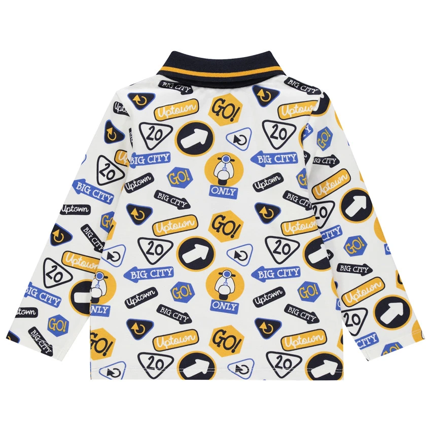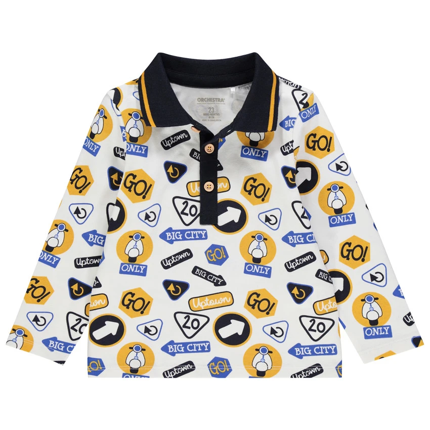 Polo manches longues en coton bio. Col polo à ouverture boutonnée sur le devant. Panneaux et scooters imprimés all-over.