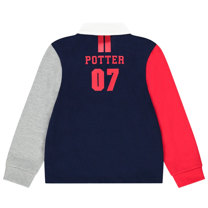 Polo tricolore pour enfant garçon. Col uni blanc. Ouverture boutonnée sous patte devant. Logo Hogwarts brodé sur la poitrine. Inscription « Potter » au dos.