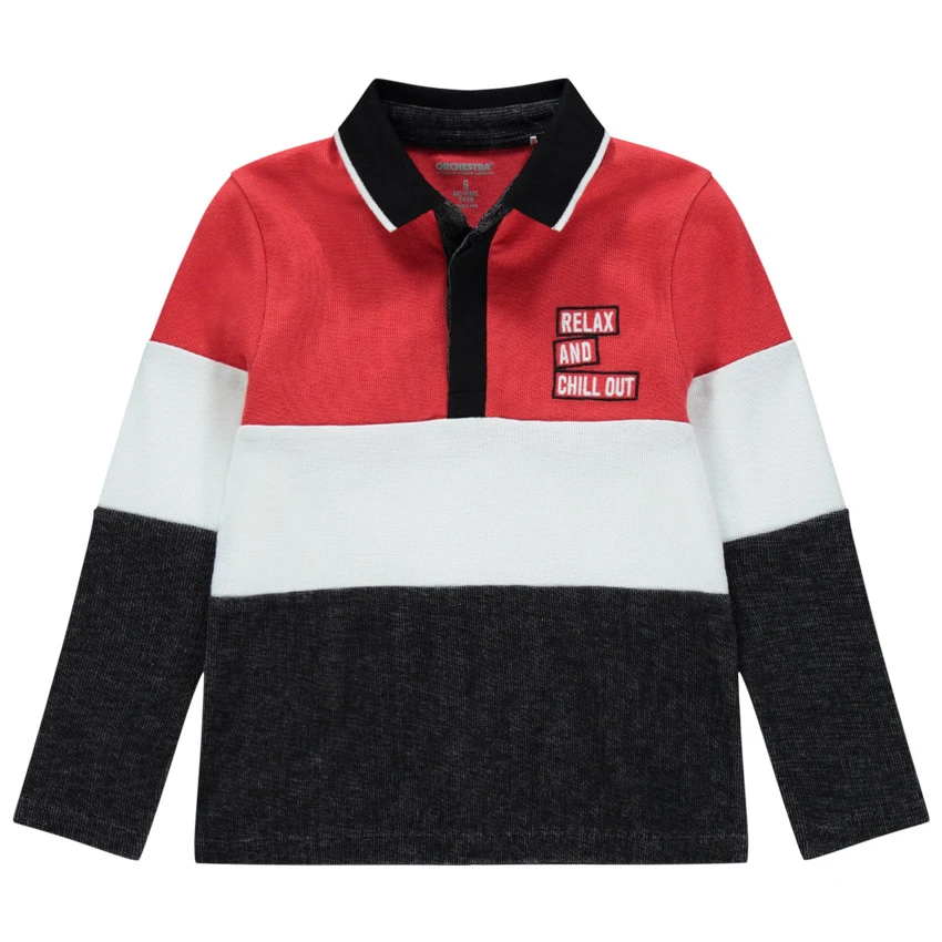 Polo manches longues tricolore. Col polo à ouverture boutonnée sous patte sur le devant. Inscriptions brodées sur la poitrine.