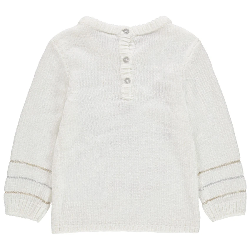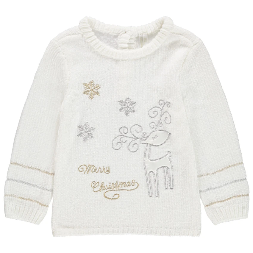 Pull en maille chenille. Encolure ronde en bord-côte. Motifs brillants brodés sur le devant esprit Noël. Poignets et base en bord-côte. Ouverture boutonnée au dos.