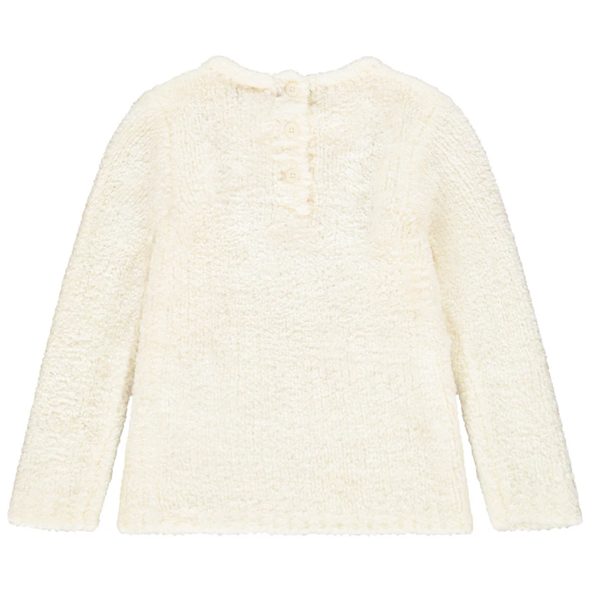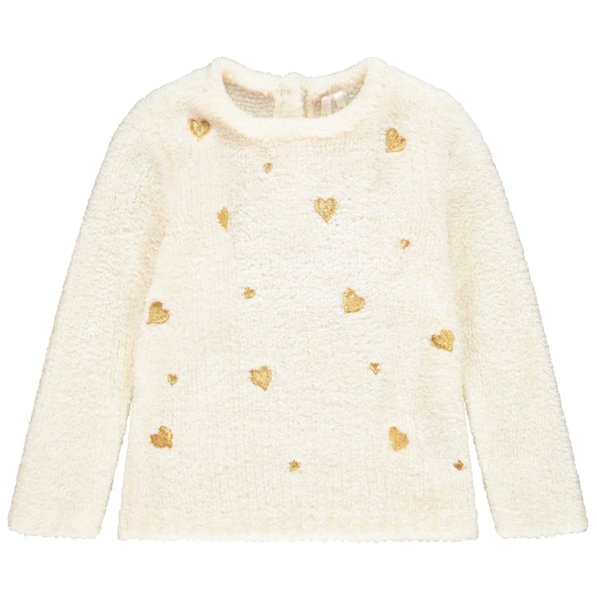 Pull chenille pour fille. Col en maille extensible. Coeurs brodés dorés sur le devant. Ouverture boutonnée au dos pour l’enfiler facilement.