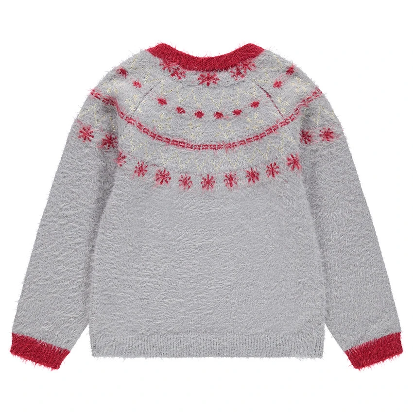 Pull de Noël en tricot poil. Encolure ronde en bord-côte. Manches raglan. Motif en jacquard. Élan en sequins sur le devant. Poignets en bord-côte contrasté.