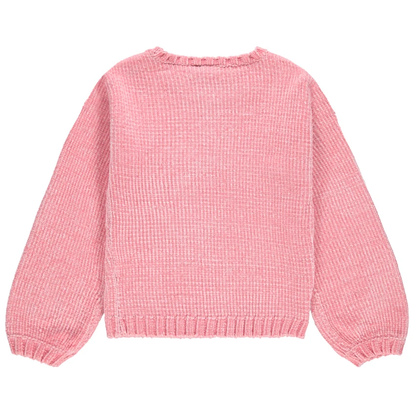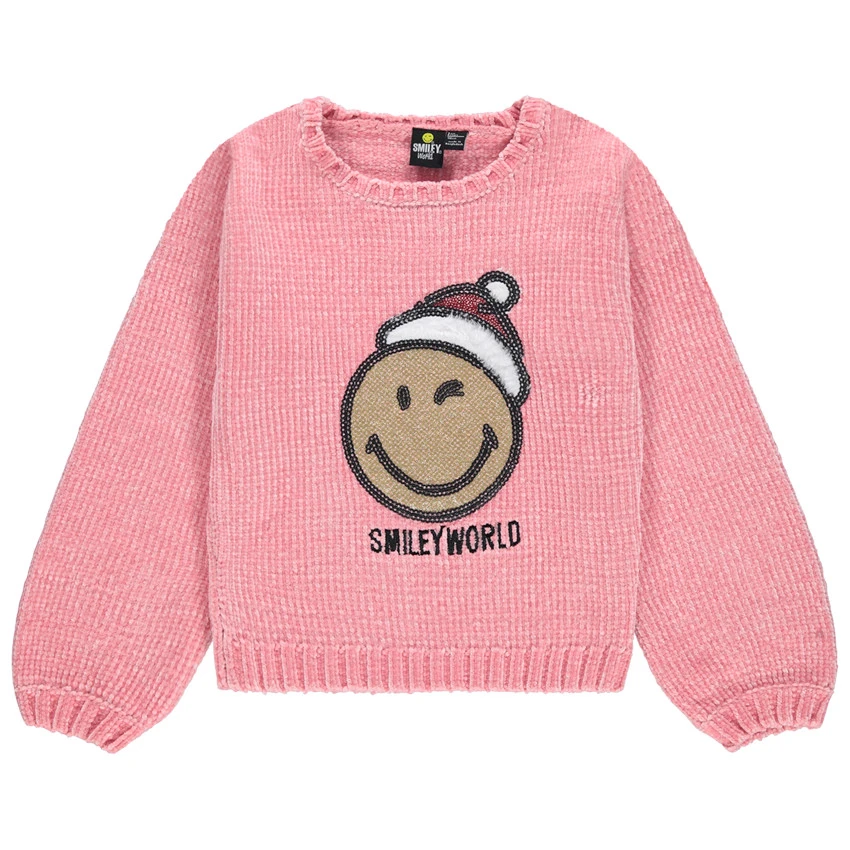 Pull chenille rose. Encolure ronde en bord-côte. Smiley en sequins esprit Noël avec sherpa. Poignets et base en bord-côte. Dos uni.