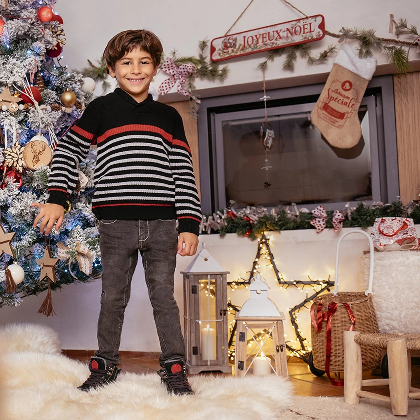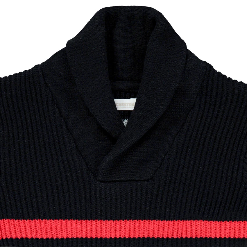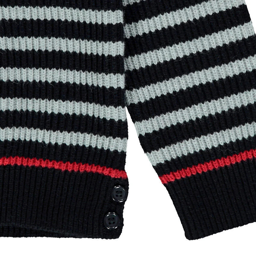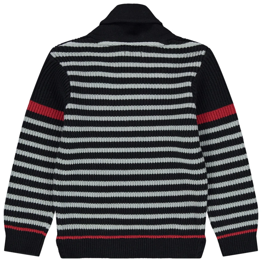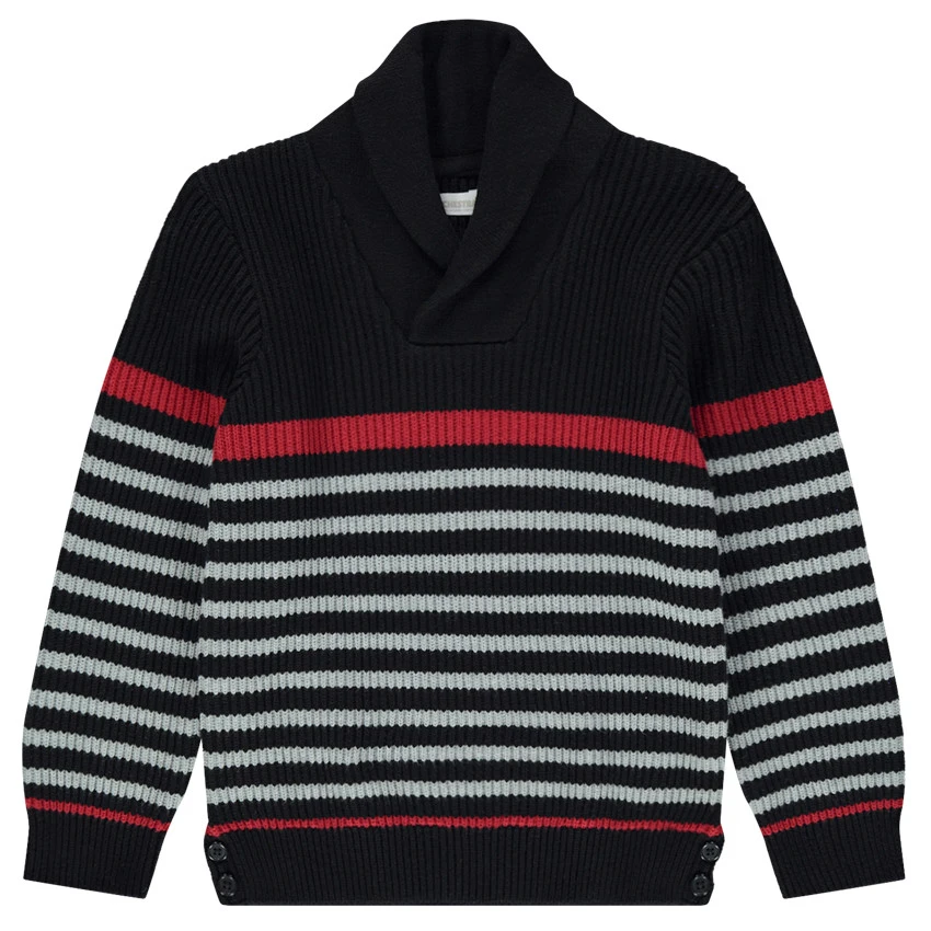 Pull en maille côtelée. Col châle. Rayures en jacquard contrastées. Poignets et bas du pull en bord-côte. Boutons fantaisie.