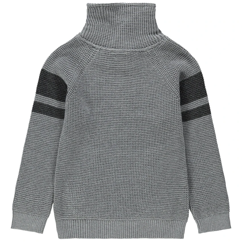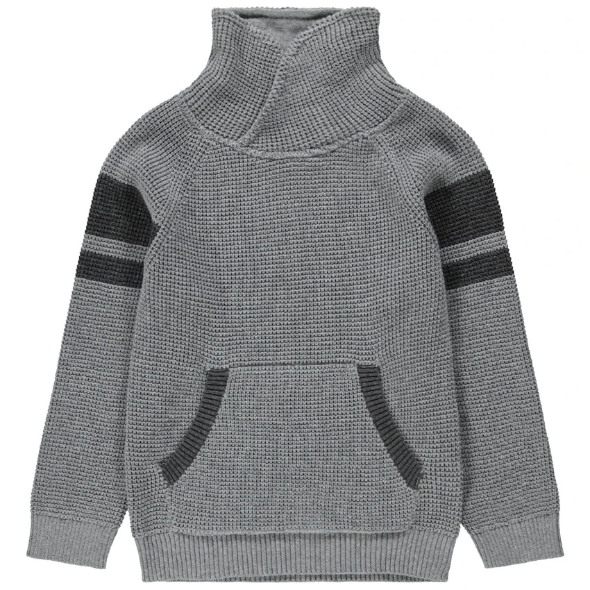 Pull en tricot fantaisie. Col croisé. Bandes en jacquard sur les manches. 1 poche kangourou sur le devant. Poignets et base en bord-côte.