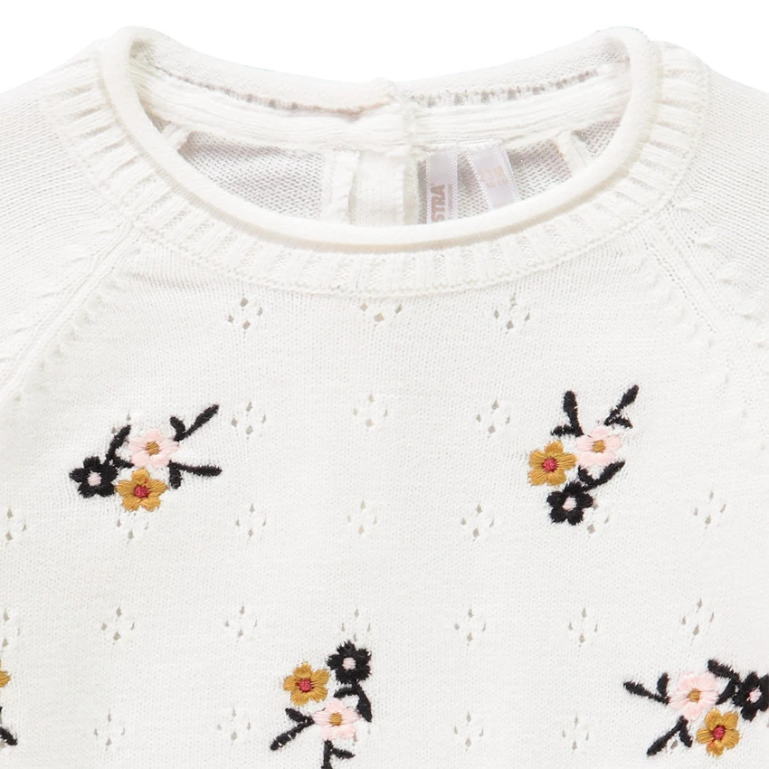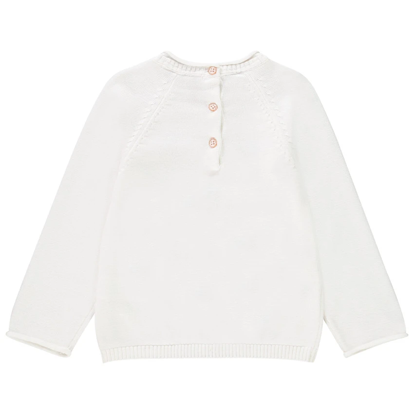 Pull en tricot pour bébé fille en maille ajourée. Col rond en maille extensible. Manche raglan. Fleurs brodées. Mange raglan pour plus de liberté de mouvements et pour l’enfiler plus facilement. Poignets roulottés. Base en maille extensible. Ouverture boutonnée au dos pour l’enfiler facilement. Boutons pailletés.