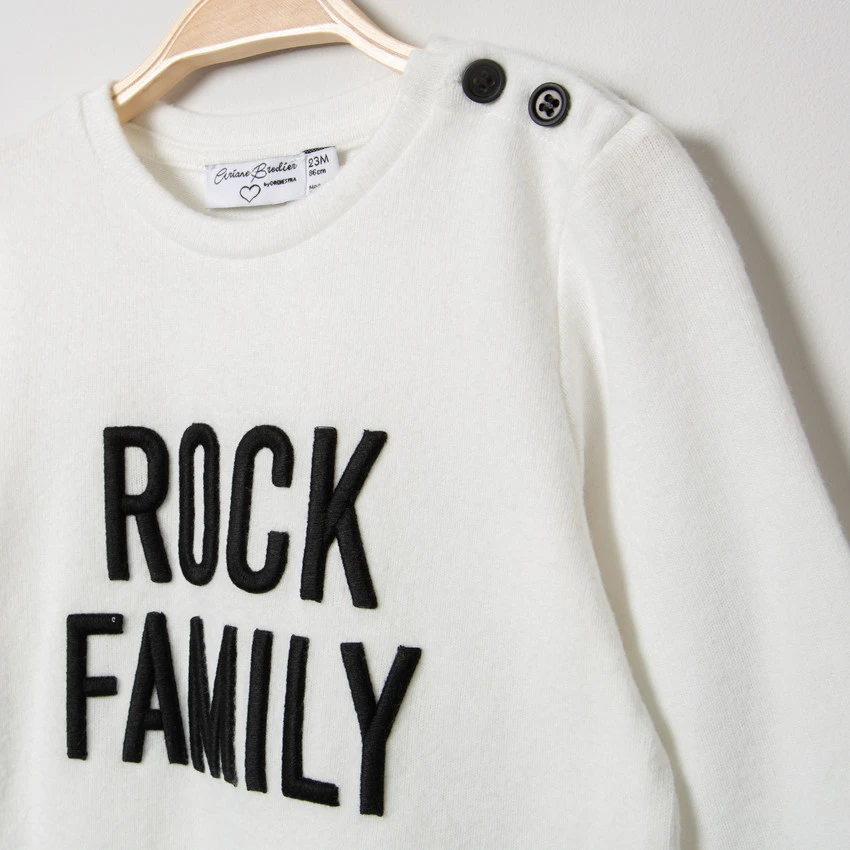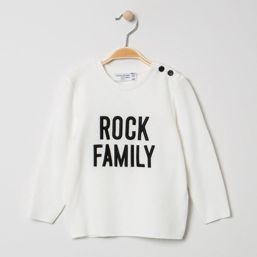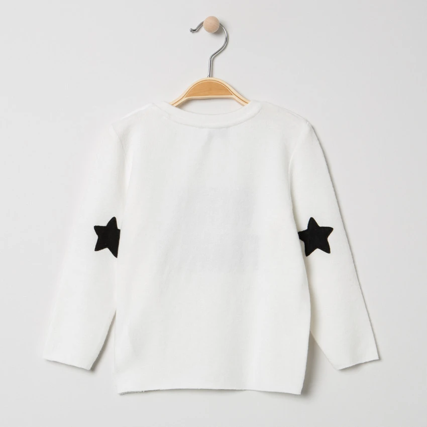 Pull en tricot uni. Encolure ronde en bord-côte. Ouverture boutonnée sur l’épaule. Inscription brodée en relief devant. Étoiles contrastées sur les coudes.