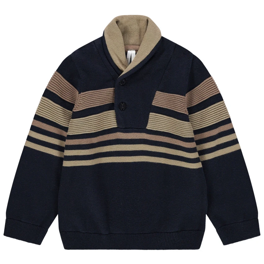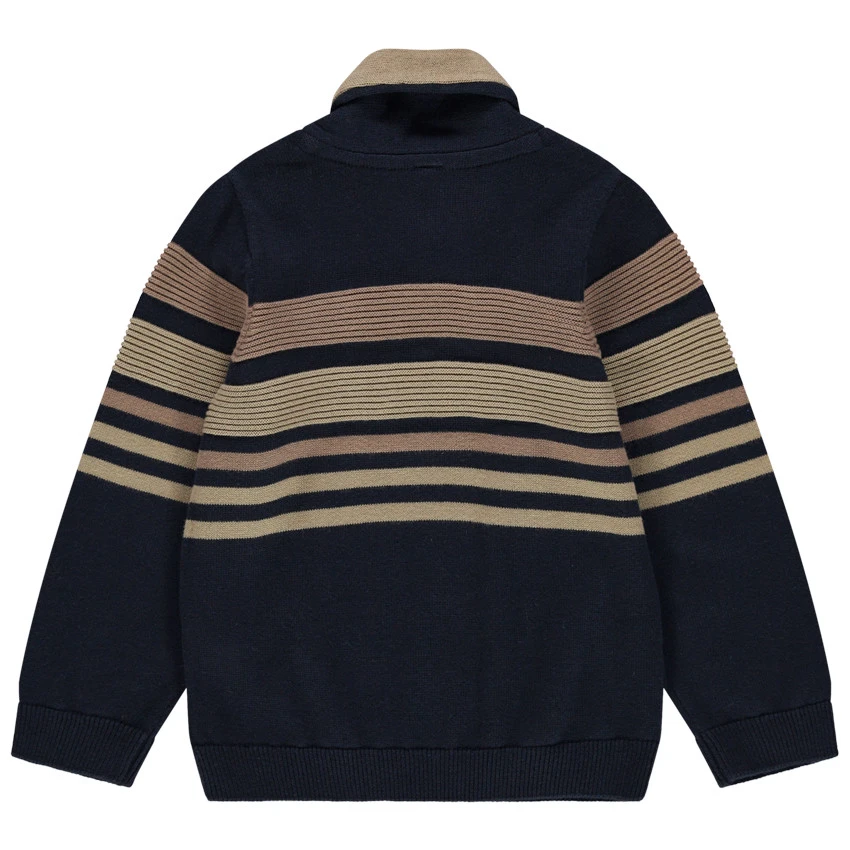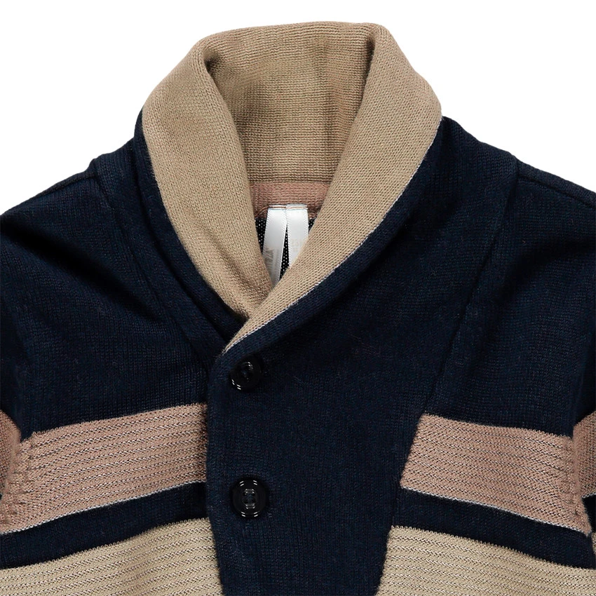 Pull en tricot. Col châle boutonné devant. Rayures placées en jacquard. Poignets et base en bord-côte.