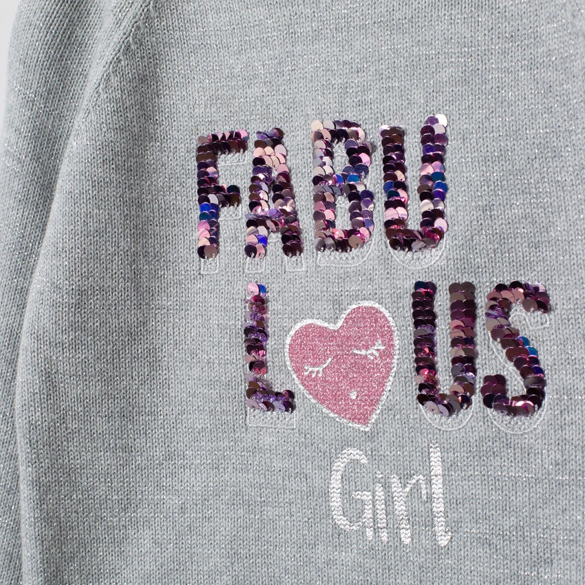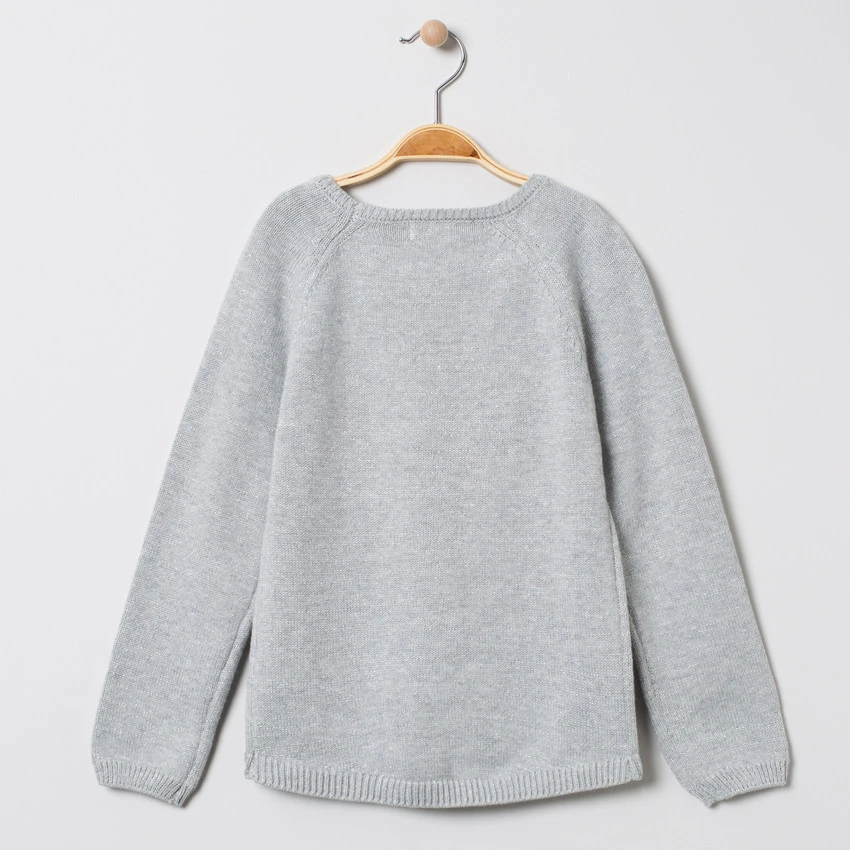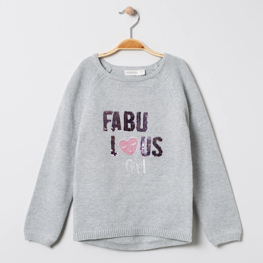 Pull en tricot mélangé de fils argentés. Encolure ronde en bord-côte. Manches raglan. Message en sequins magiques. Poignets et base en bord-côte. Dos uni.