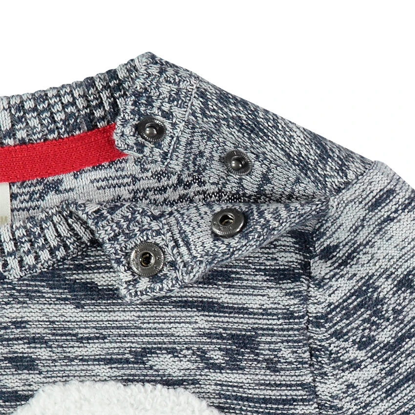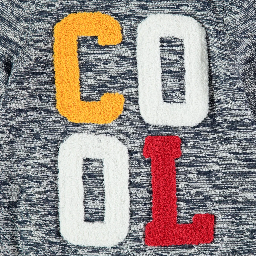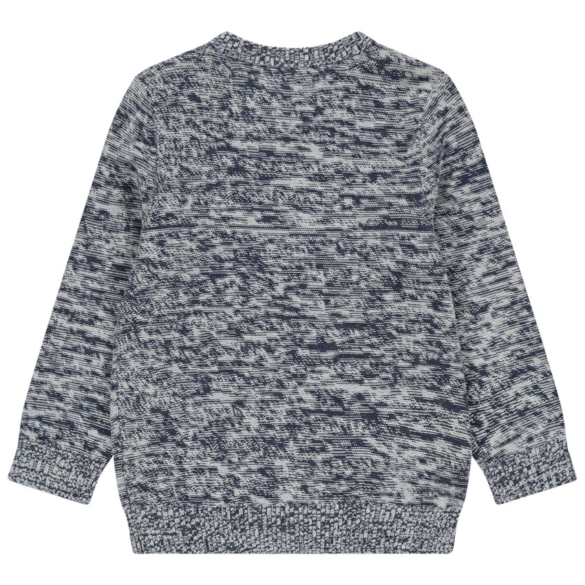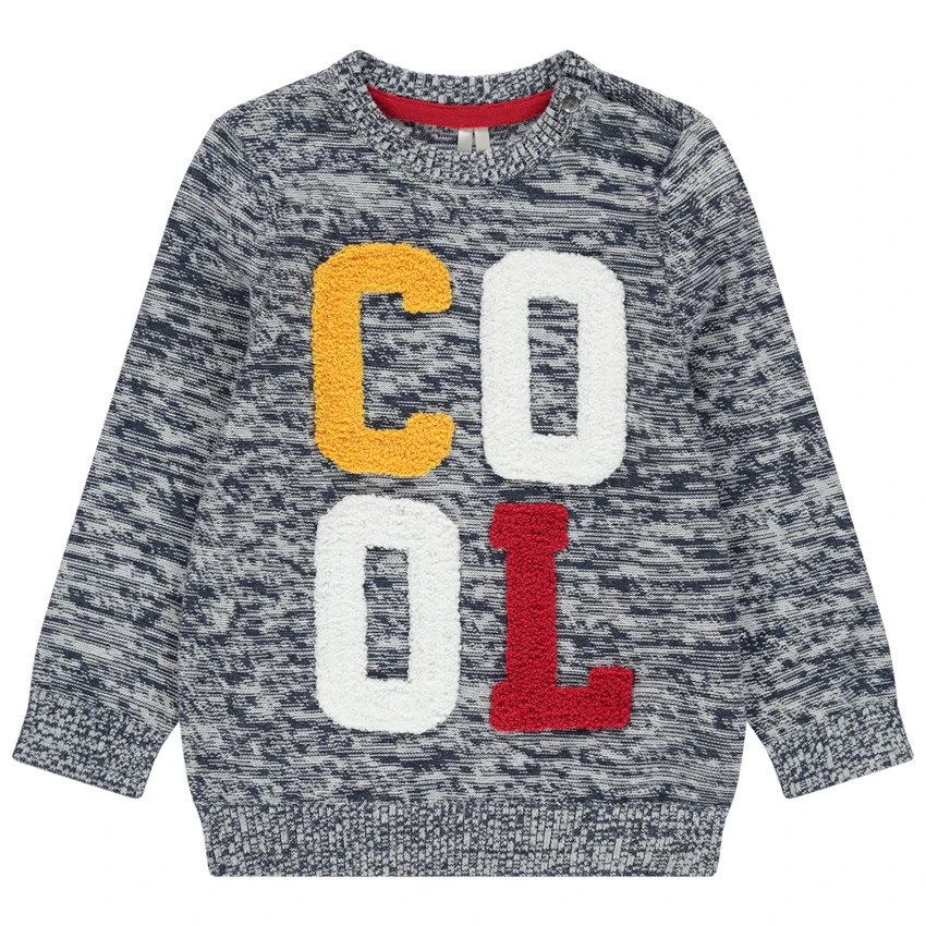 Pull en tricot chiné. Encolure ronde en bord-côte. Inscription en bouclette sur le devant. Finitions en bord-côte.