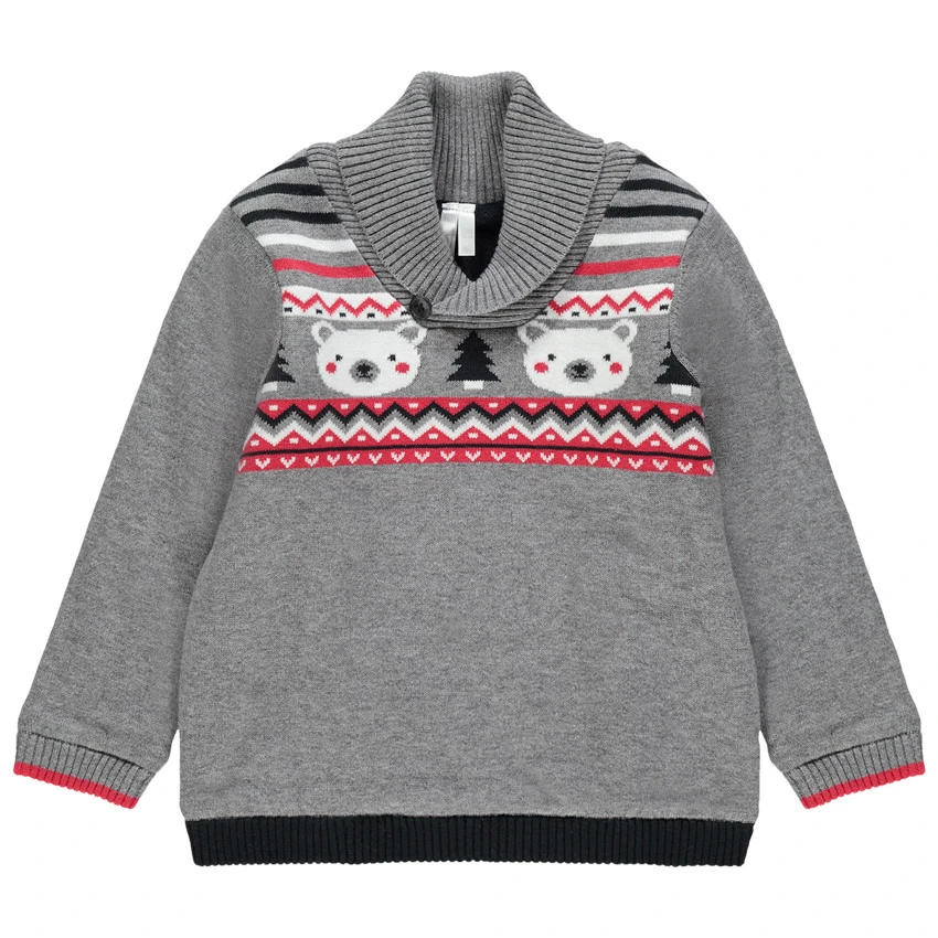 Pull en tricot gris chiné. Col châle en bord-côte. Motifs esprit Noel en jacquard. Poignets et base en bord-côte.