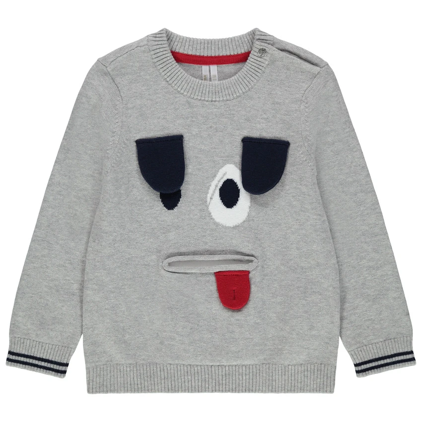 Pull en tricot ris chiné. Encolure ronde en bord-côte. Ouverture pressionnée sur le côté du col. Motif chien en jacquard avec oreilles en relief. Poignets et base en bord-côte. Dos uni.