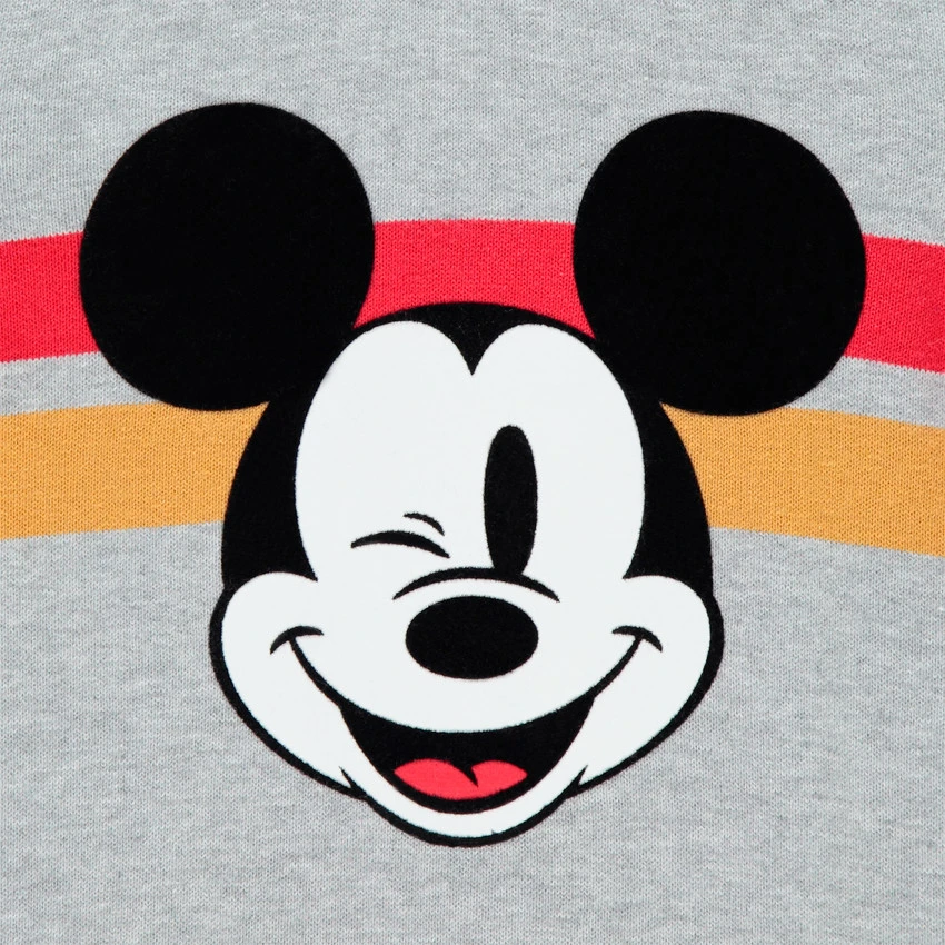 Pull en tricot à manches bicolores. Encolure ronde en maille extensible pour faciliter le passage de la tête. Motif Mickey brodé devant. Poignets et base en Bord-côte. Bandes contrastées au dos.