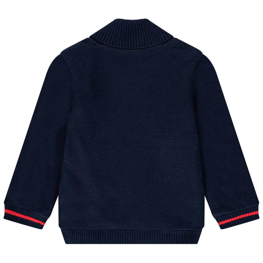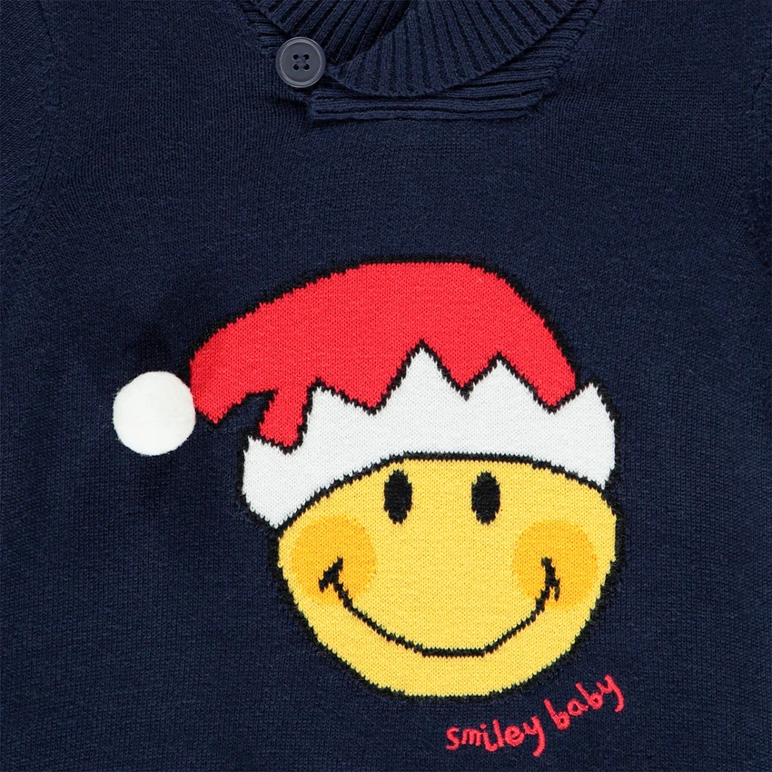 Pull en tricot uni. Col châle en maille extensible avec bouton. Smiley Baby Noël en jacquard sur le devant. Poignets et base en maille extensible avec fil élastiqué pour éviter leur déformation. Doublure en velours pour plus de confort.