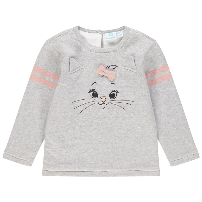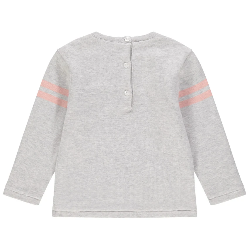 Pull en tricot chiné. Encolure ronde en bord-côte. Marie printée devant avec oreilles en relief et noeud. Bandes contrastées sur les manches. Ouverture boutonnée au dos.