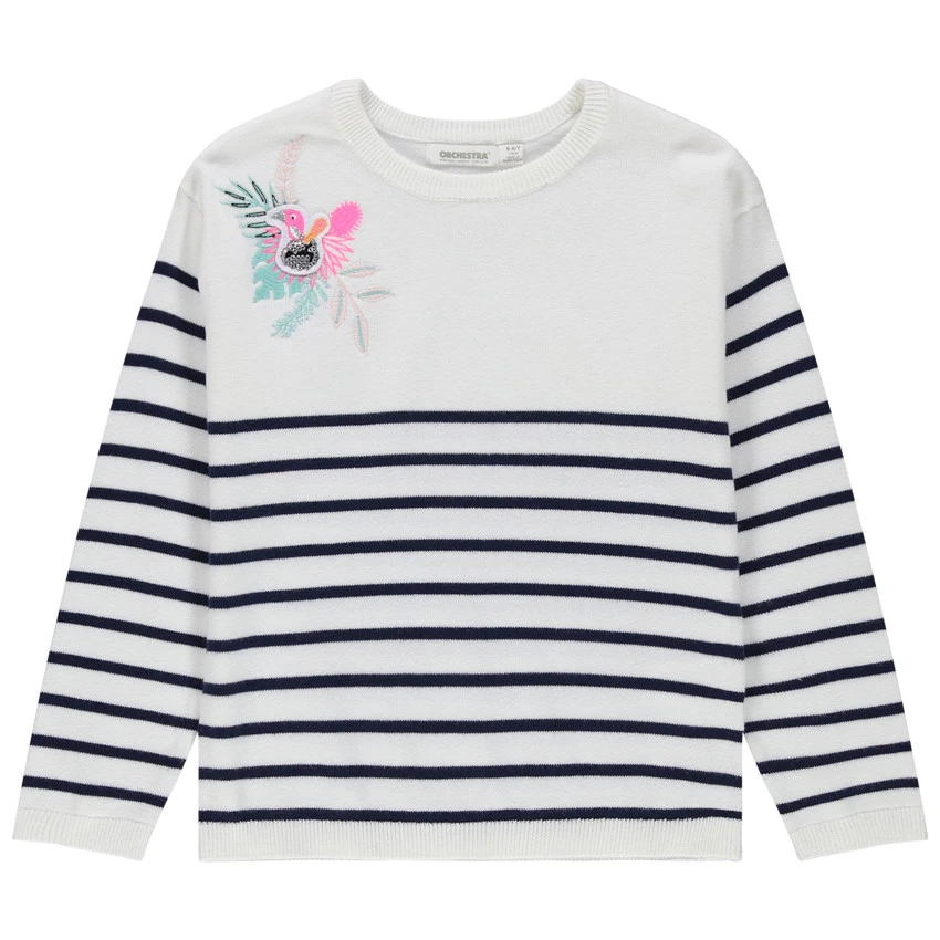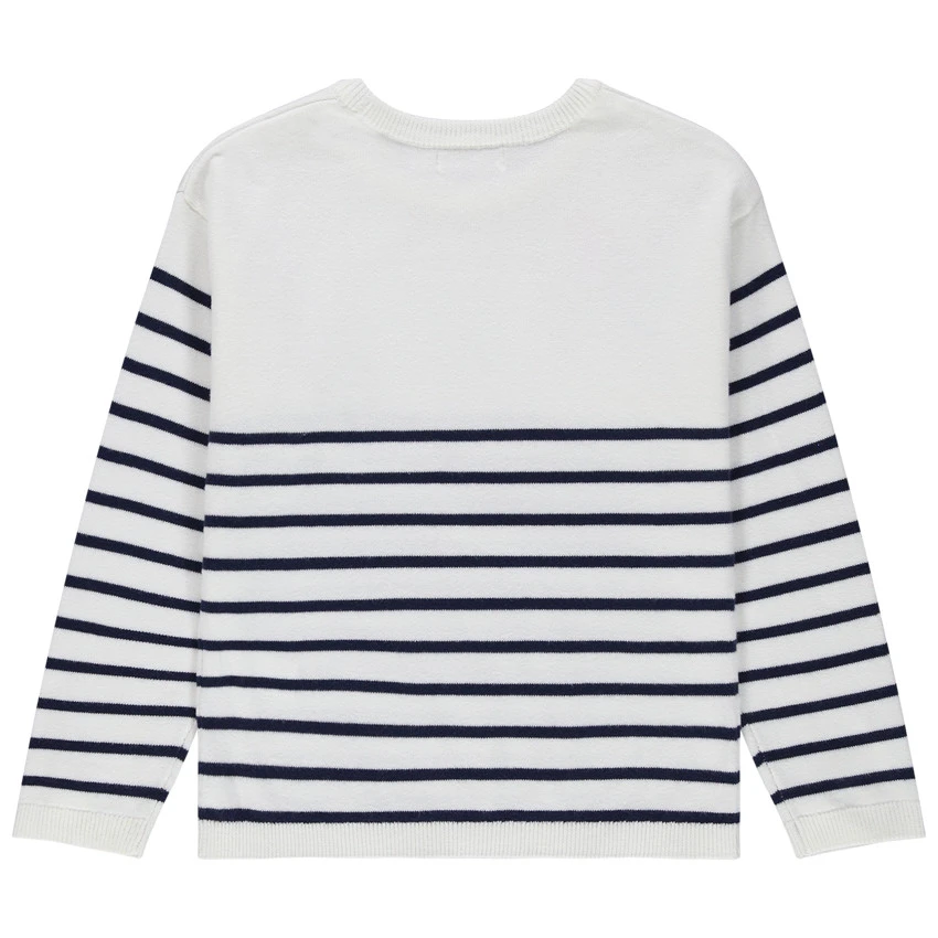 Pull en tricot. Encolure ronde en bord-côte. Motif brodé sur le devant. Rayures placées en jacquard. Poignets et base en bord-côte.