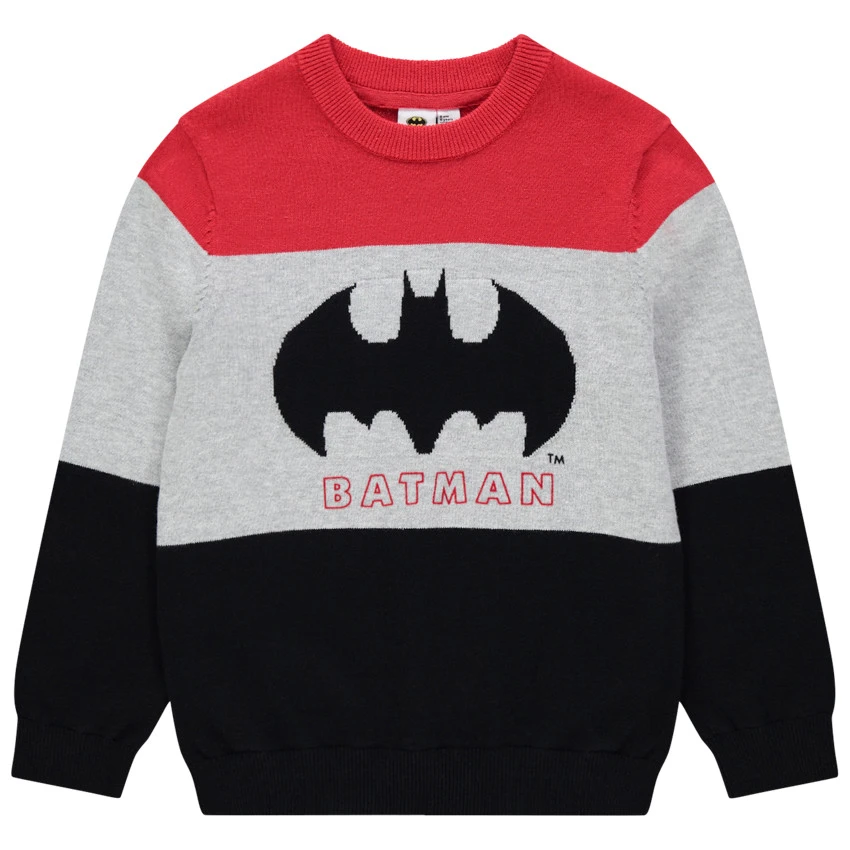 Pull en tricot tricolore. Encolure ronde en maille extensible. Motif Batman en jacquard sur le devant. Finitions en bord-côte.