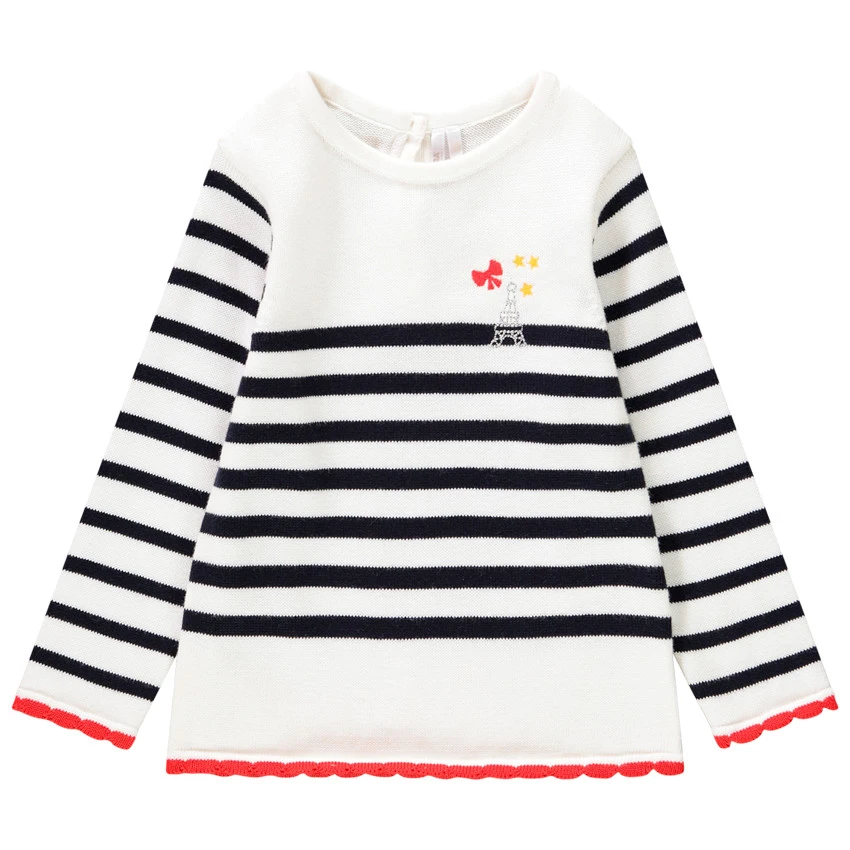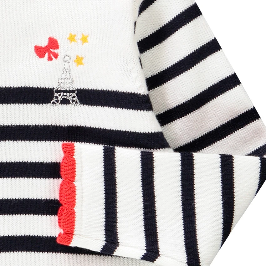 Pull marinière. Col rond. Motif brodé sur la poitrine. Volants contrastés en bas et aux poignets.