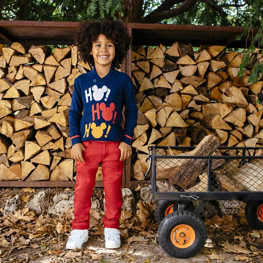 Pull en tricot Mickey. Col châle en bord-côte avec bouton. Mickey en jacquard sur le devant. Poignets et base en bord-côte contrasté.