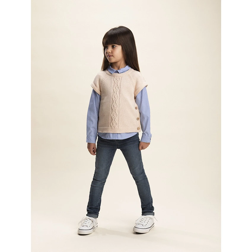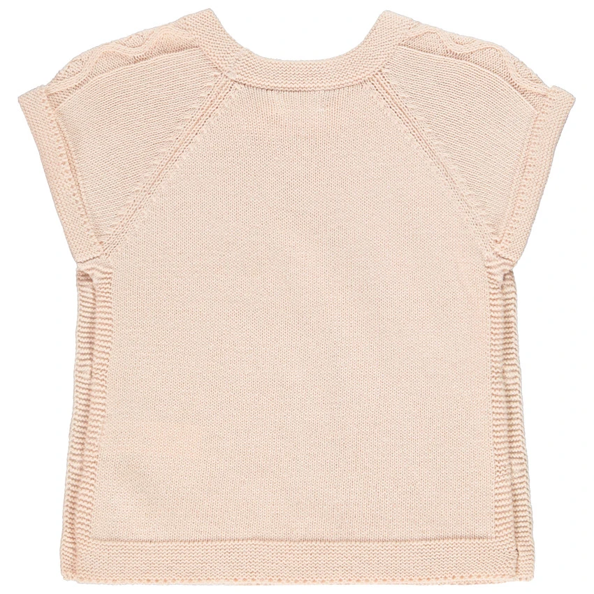 Pull sans manches. Col rond. Manches courtes. Jeux de mailles. Ouverture boutonnées sur les côtés.