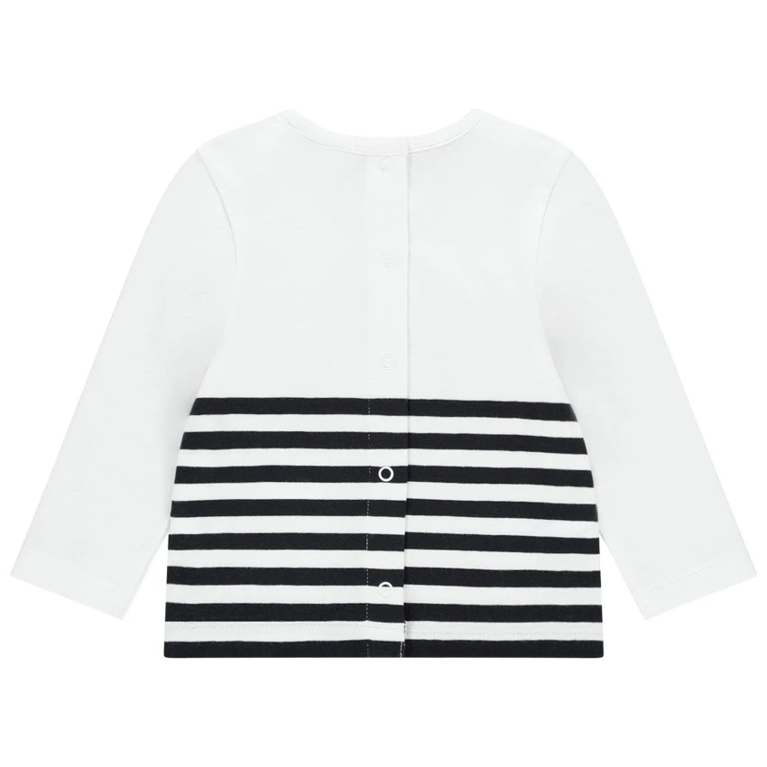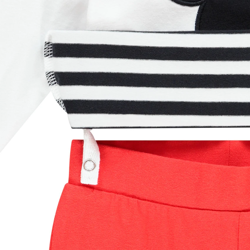 T-shirt manches longues. Encolure ronde. Print Minnie et rayures sur la moitié du t-shirt. Ouverture pressionnée dans le dos. Liens à pressionner sur le pantalon.