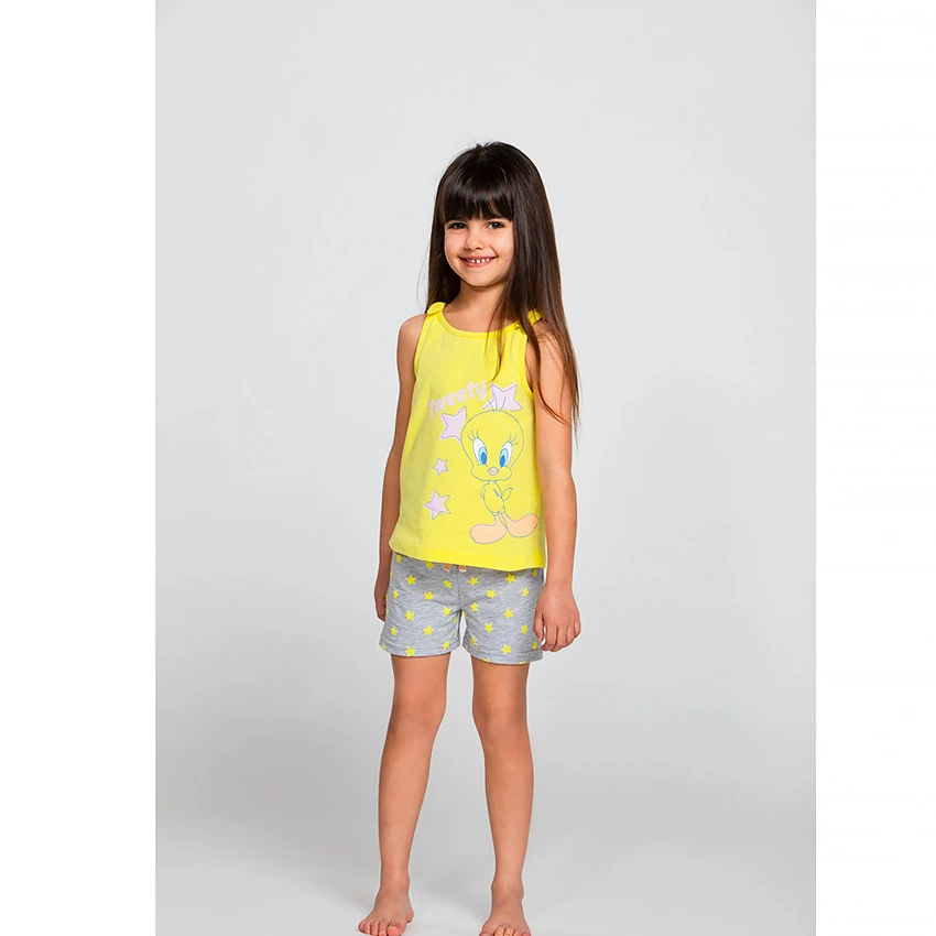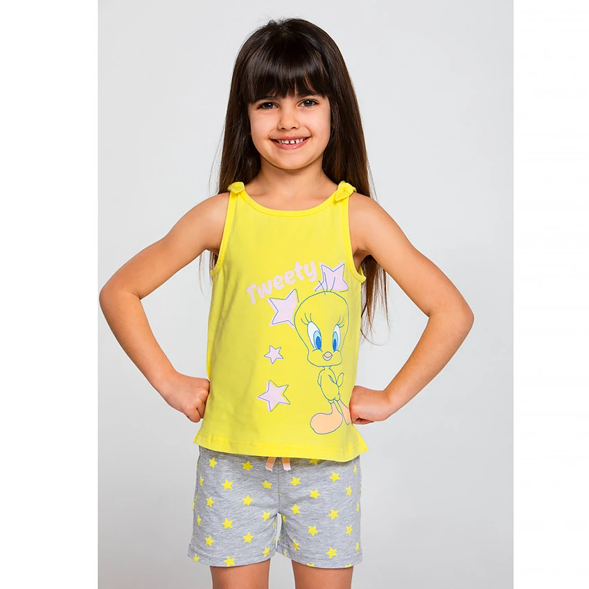 Débardeur encolure ronde. Bretelles avec noeuds fantaisie. Print Titi et étoiles sur le devant.