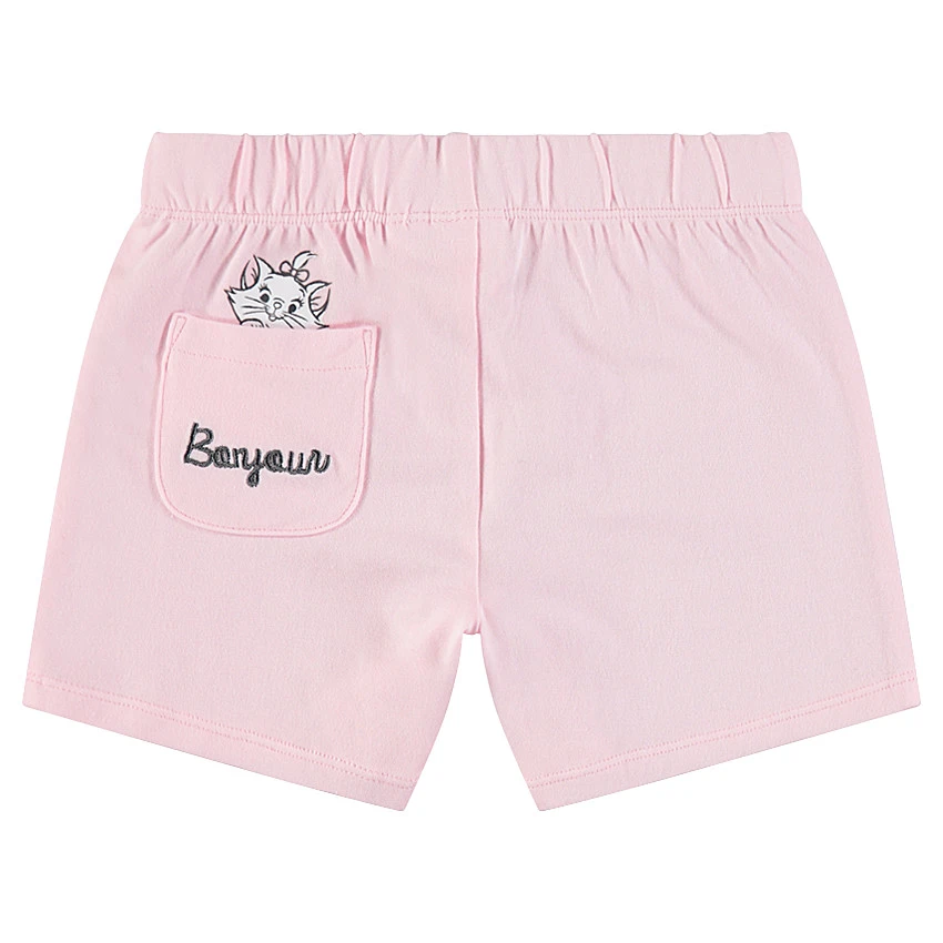 Short en jersey uni. Taille élastiquée pour un maximum de confort. 1 poche plaquée au dos avec Marie printée et broderie.