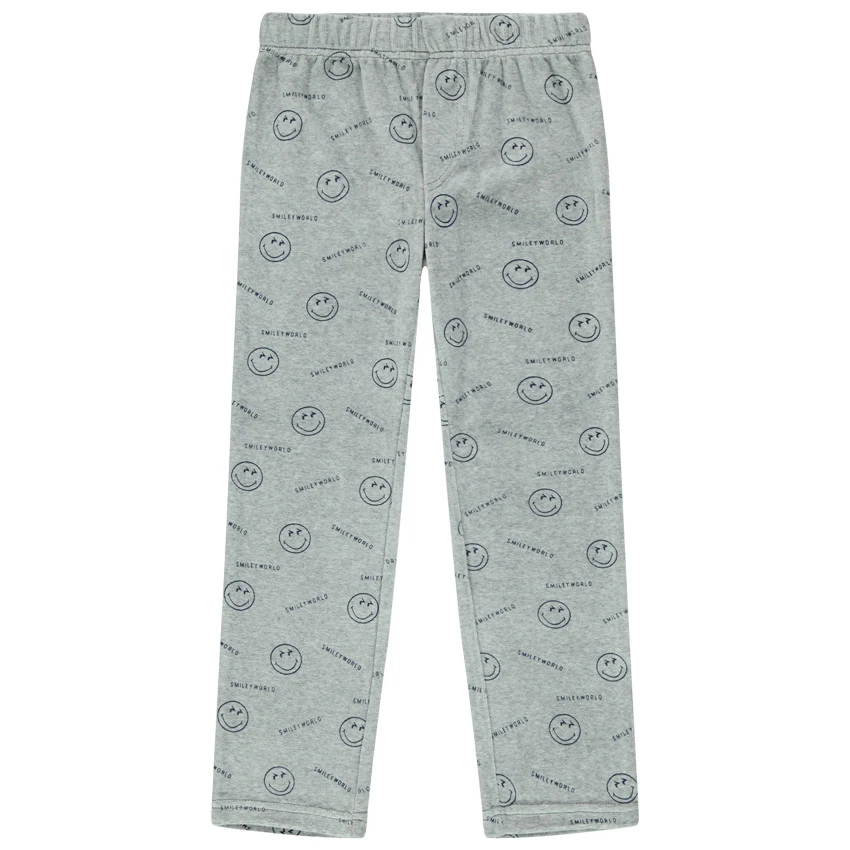 Pantalon en velours gris chiné. Taille élastiquée. Smiley printé all-over.