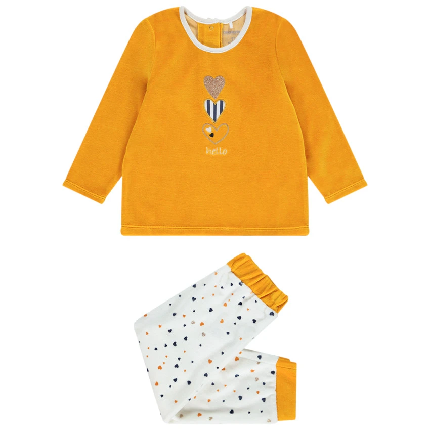 Haut de pyjama en velours jaune. Col rond en maille extensible. Coeurs brodés et printés avec touches de paillettes. Ouverture pressionnée au dos pour faciliter l’habillement adaptée à l’âge. Liens à pressionner pour relier le haut avec le bas et éviter que l’enfant ne se découvre pendant la nuit.