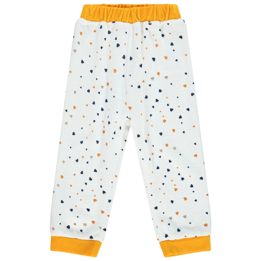 Pantalon en velours imprimé coeurs. Taille élastiquée pour un maximum de confort. Pieds fermés jusqu’au 12 mois.