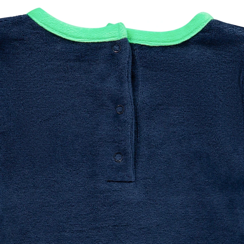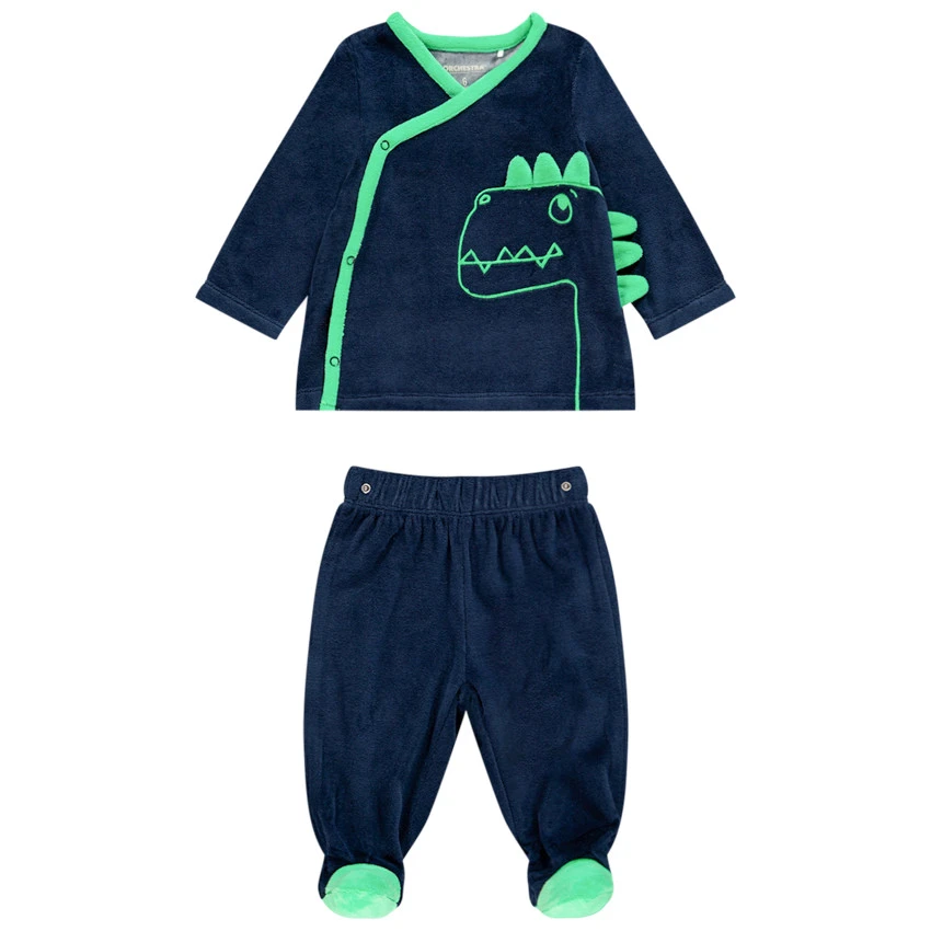 Pyjama en velours pour bébé garçon. Col contrasté. Ouverture pressionnée au dos ou devant selon l’âge. Dinosaure brodé sur le devant. Crête en relief.