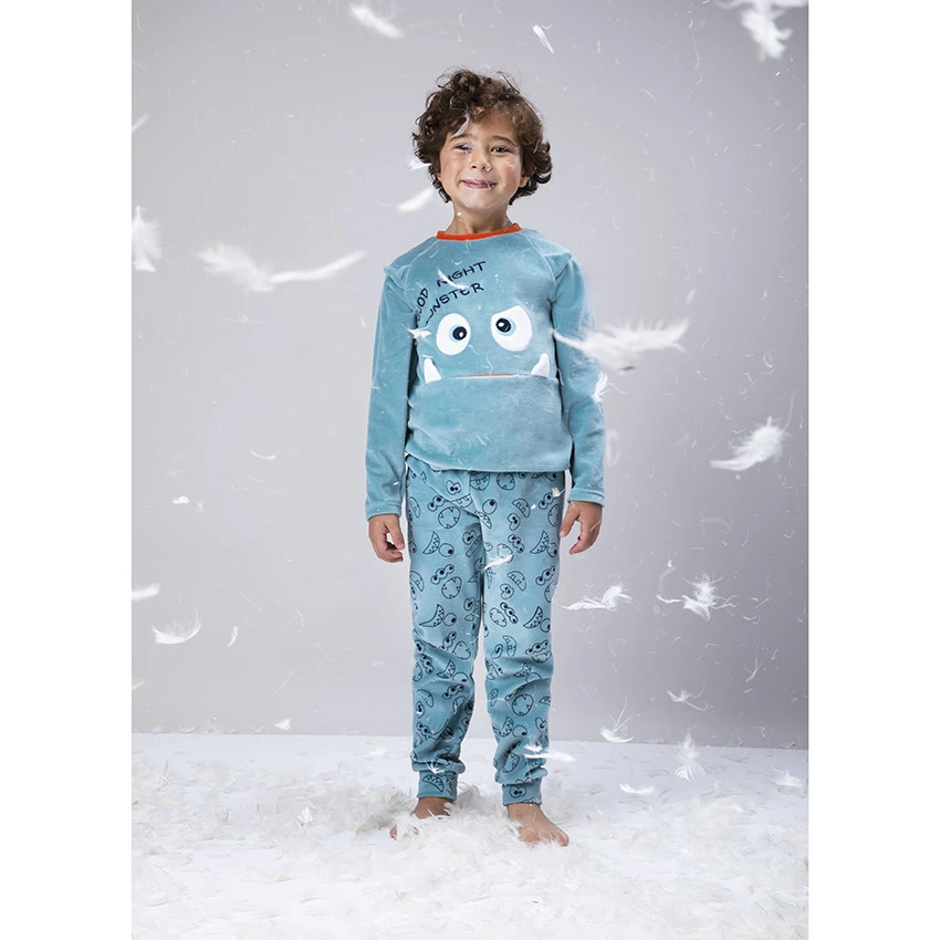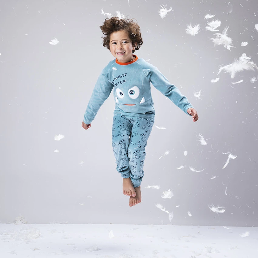 Haut de pyjama en velours. Col rond contrasté. Cornes en relief sur le devant pour le côté ludique. Monstre brodé et dents en relief. Manches raglan pour une bonne liberté de mouvements.