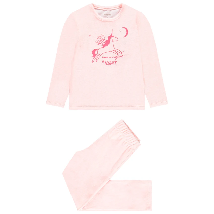 Pyjama en velours pour enfant fille. Col rond en maille extensible. Licorne printée devant. Dos uni.