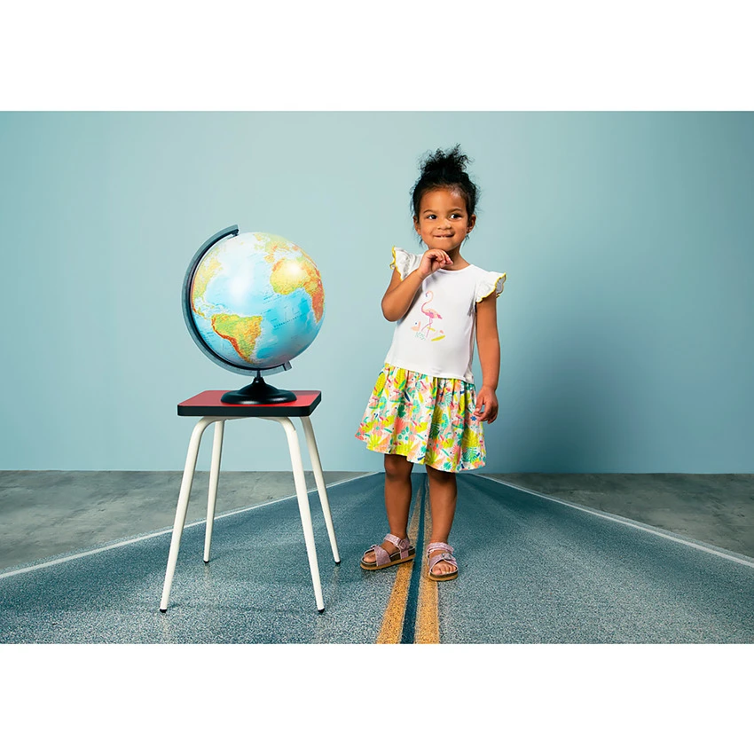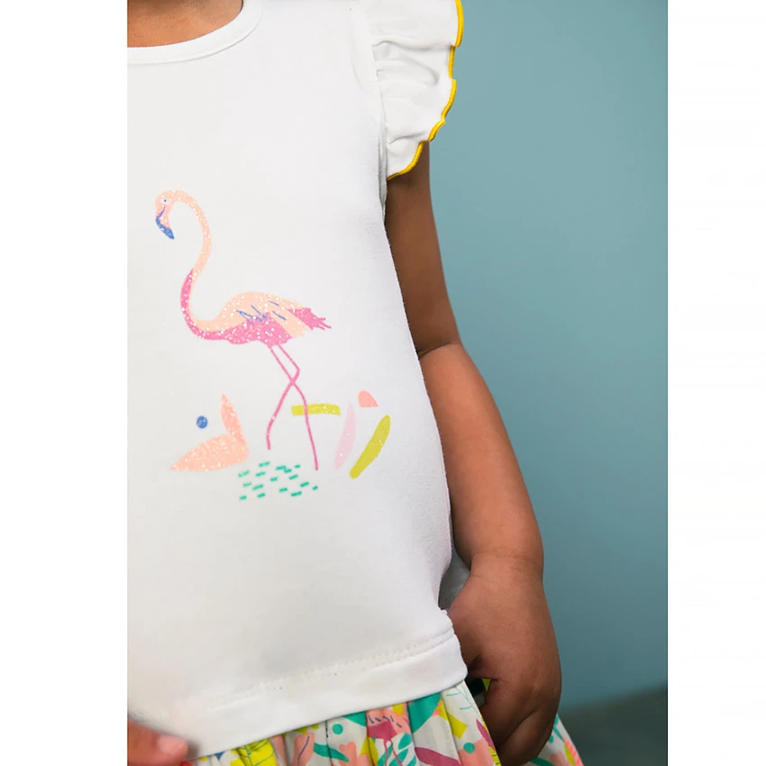 Robe 2 en 1. Haut uni à encolure ronde. Manches courtes volantées avec liseré de finition contrasté. Print flamant rose sur le devant. Ouverture boutonnée fantaisie dans le dos. Bas effet plissé. Imprimé tropical all-over.